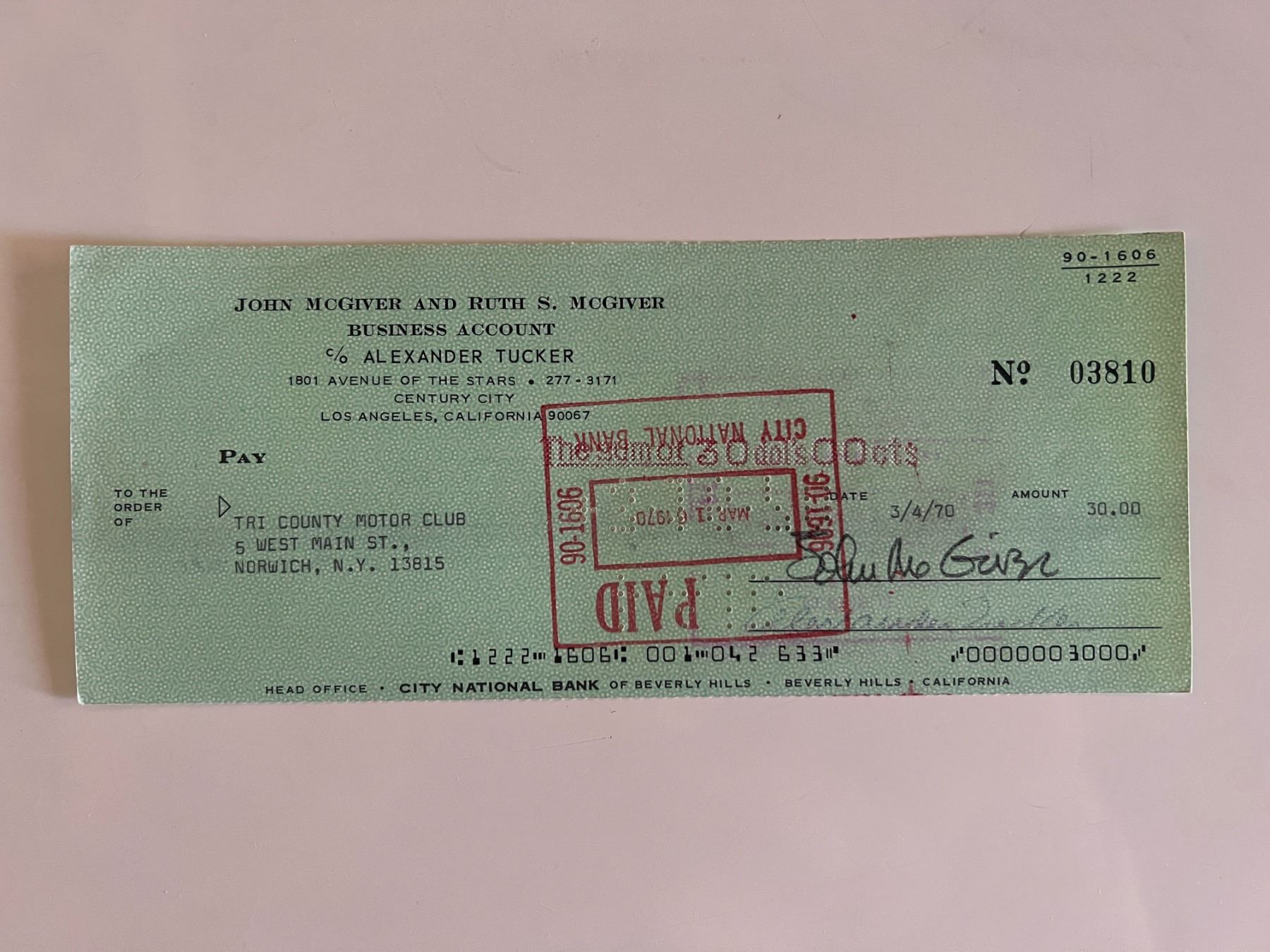 John McGivern signed check dated March 4th, 1970