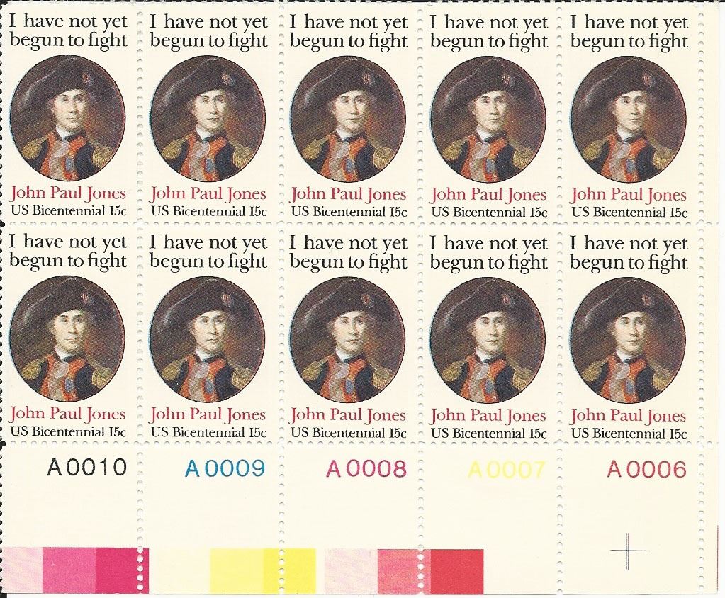John Paul Jones Stamps, "I have not yet begun to fight" U.S. Bicentennial. Block of 8 x 15c Stamps