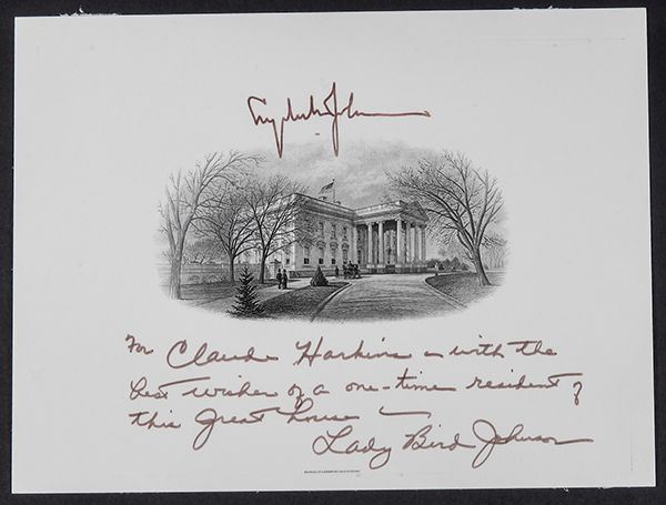 Johnson, Lyndon B. and Lady Bird. Lovely depiction of the White House during horse-and-buggy days signed "Lyndon B. Johnson" at the top, signed and inscribed at the bottom, "For Claude Harkins --with the best wishes of a one-time resident of this great house. Lady Bird Johnson," 8 x 6 in., n.p., n. d. Portrait of the White House published by the Bureau of Engraving and Printing. Excellent condition. Ex Claude Harkins Collection.
