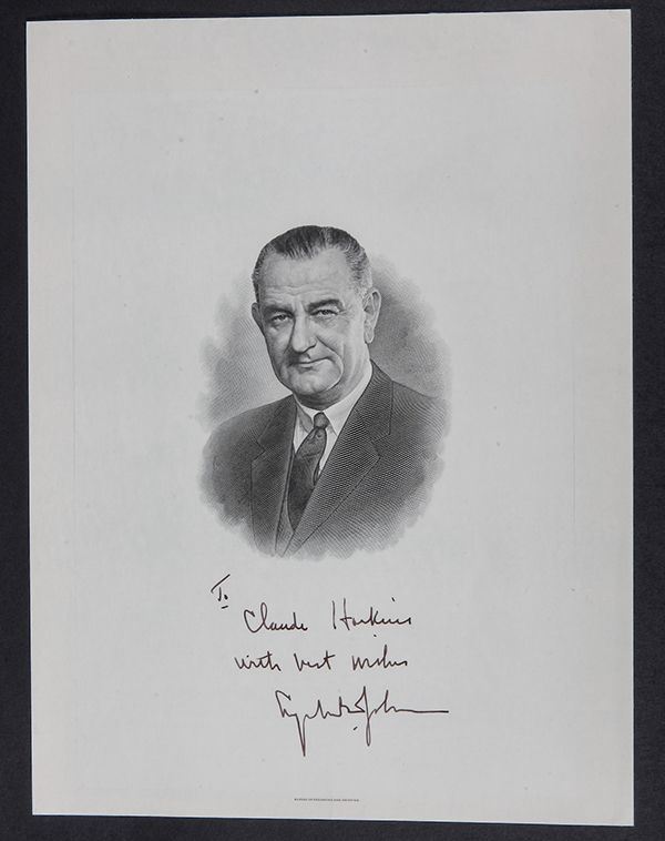 Johnson, Lyndon B. Signed, inscribed portrait from the Bureau of Engraving and Printing, "To Claude Harkins with best wishes Lyndon B. Johnson," 9 x 11� in., n.p., n.d. Signed after President Johnson's retirement to Austin, Texas. Excellent condition. Ex Claude Harkins Collection.