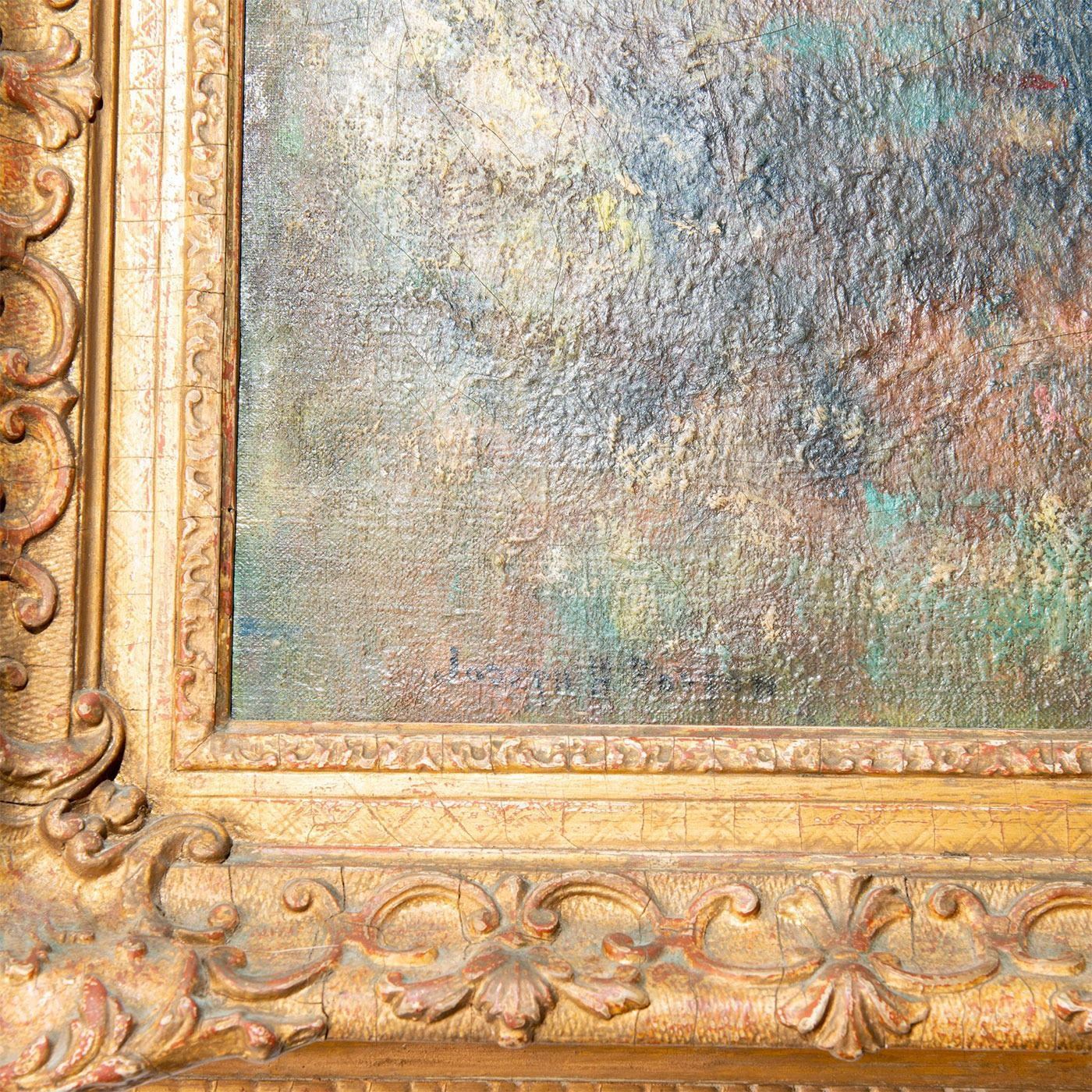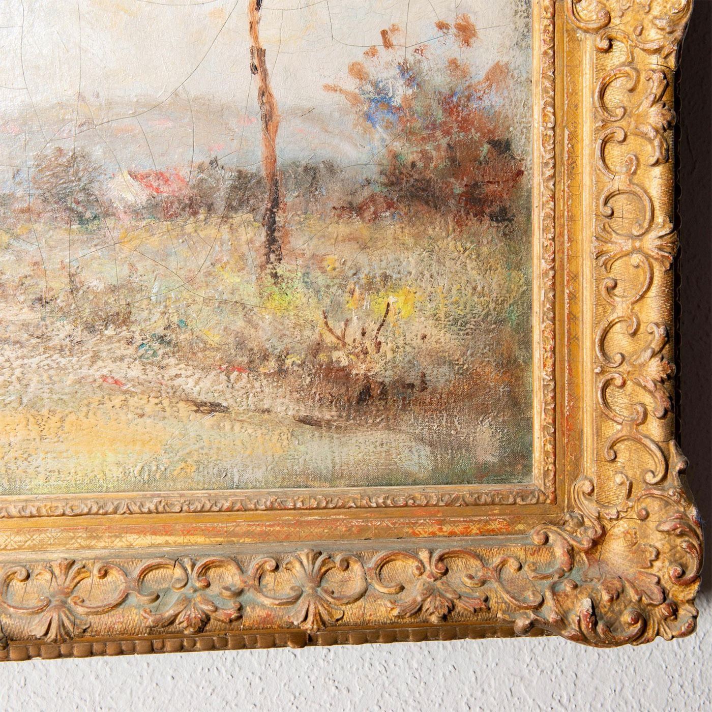 Paint on board. Impressionist landscape scene depicts trees and man and haywagon in distance. Stunning piece with masterful daubs and smudging techniques. Signed Joseph on lower left corner. Housed on ornate wooden frame. Age related wear; crazing lines to painting.