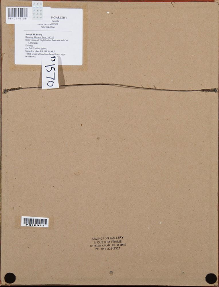 Artist: Joseph Henry Sharp; Title: Set of Three: Standing Deer - Taos; White Swan - Crow; Running Horse - Taos; Medium: Etching; Dimensions: Set of three (3): 5 x 3 1/2; 6 x 4 1/2; 5 1/2 x 3 3/4 inches; Signed: Signed in etching with edition numbers lower right; Framed/Base: 17 x 13 inches (each)
