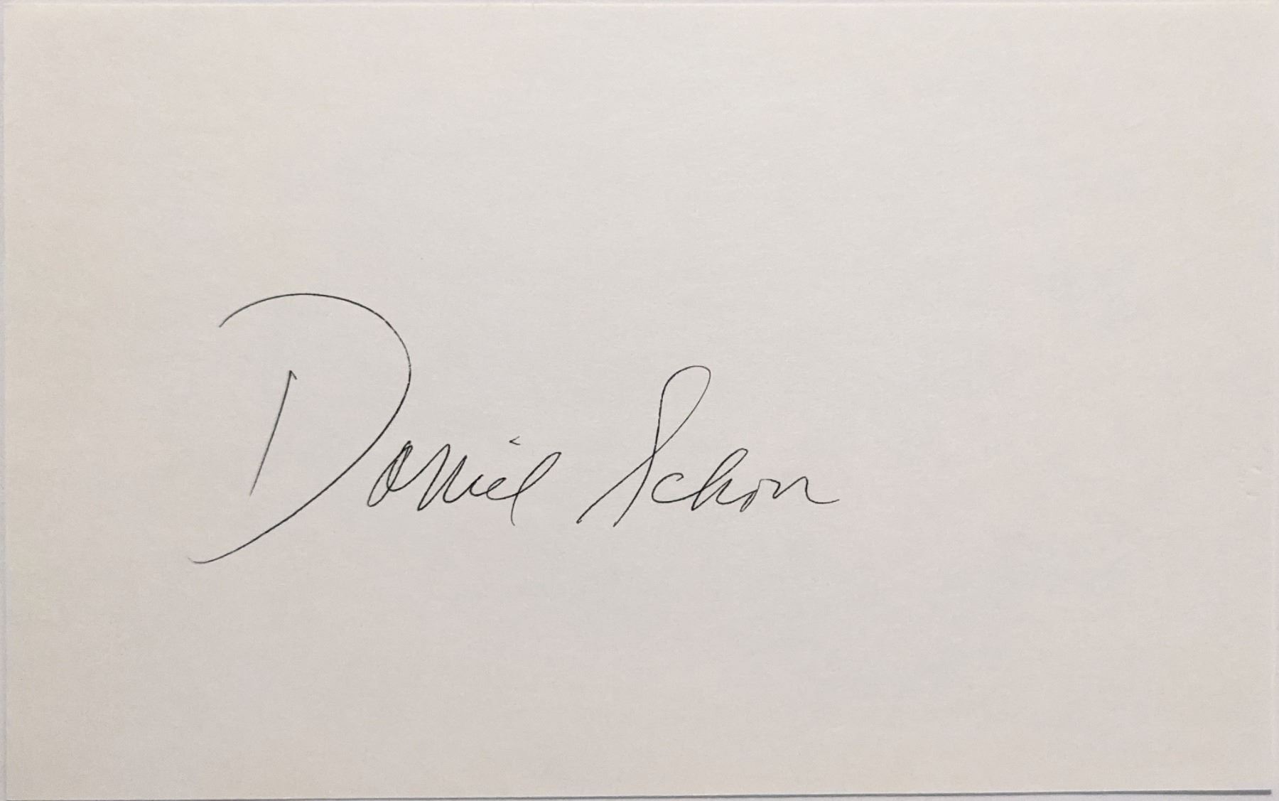 Journalist Daniel Schorr signature. 5 x 8 inches.