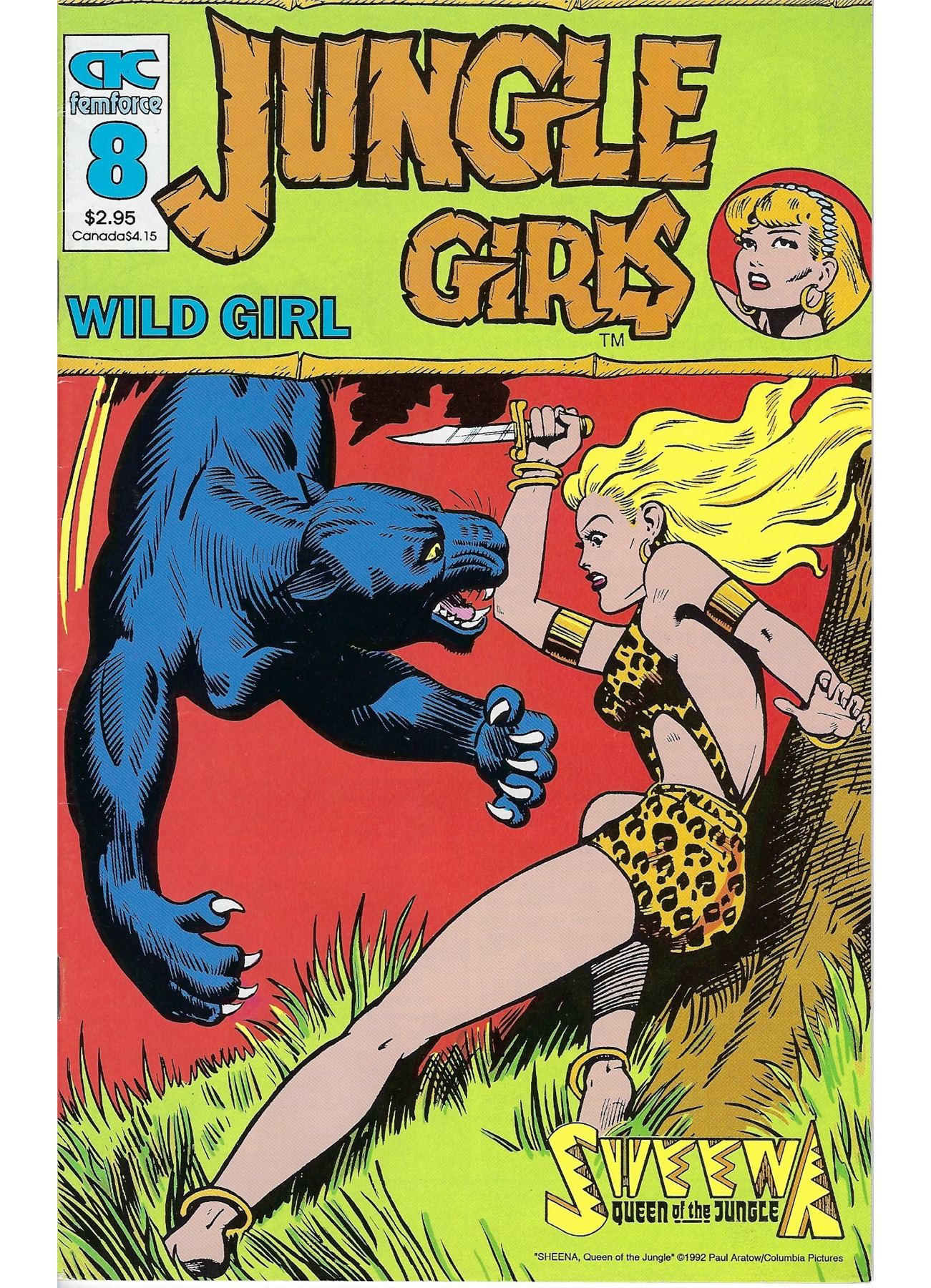 Jungle Girls (1988) #8 - Wild Girl comic. Edited by Bill Black. Stories by Bill Black and Bill Feret. Art by Robert Webb and Bob Lubbers. AC Comics reprints classic jungle-girl stories that originally appeared in comics from the Golden Age, along with some new ones. This issue focuses on Fiction House, publisher of the immortal Sheena and other jungle heroes, both female and male. Sheena, Queen of the Jungle and Bob get caught up in the power struggle over an African throne; Ann and Kaanga confront poachers in the wild; Con artists impersonate Camilla, Wild Girl of the Congo, in order to turn her tribal allies against her. Jungle Girls; Sheena Queen of the Jungle; Camilla Wild Girl of the Congo; Ann and Her Mate; Tara; Cave Girl; Neon Jungle Girls! 32 pages, B&W. Cover price $2.95.