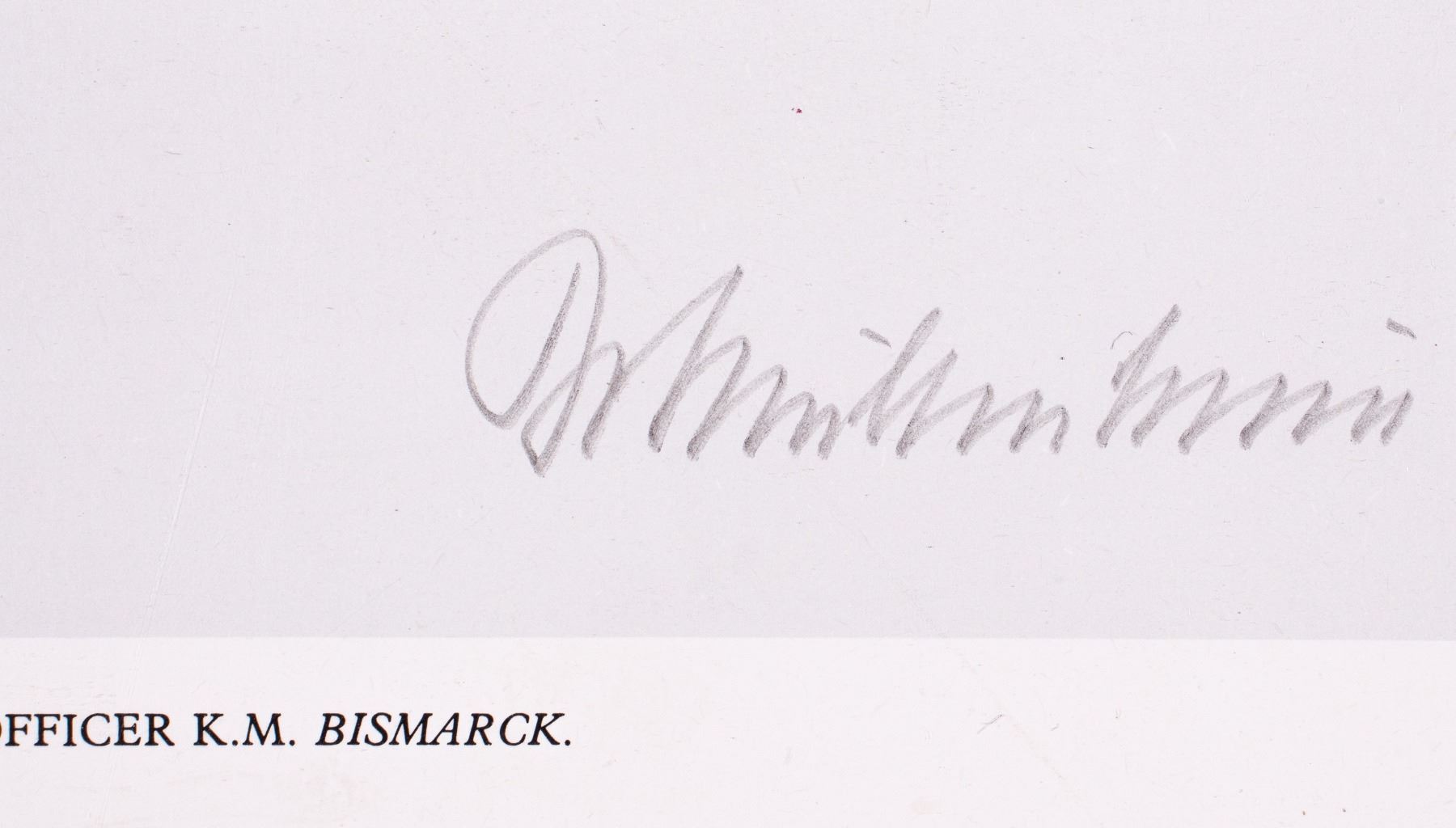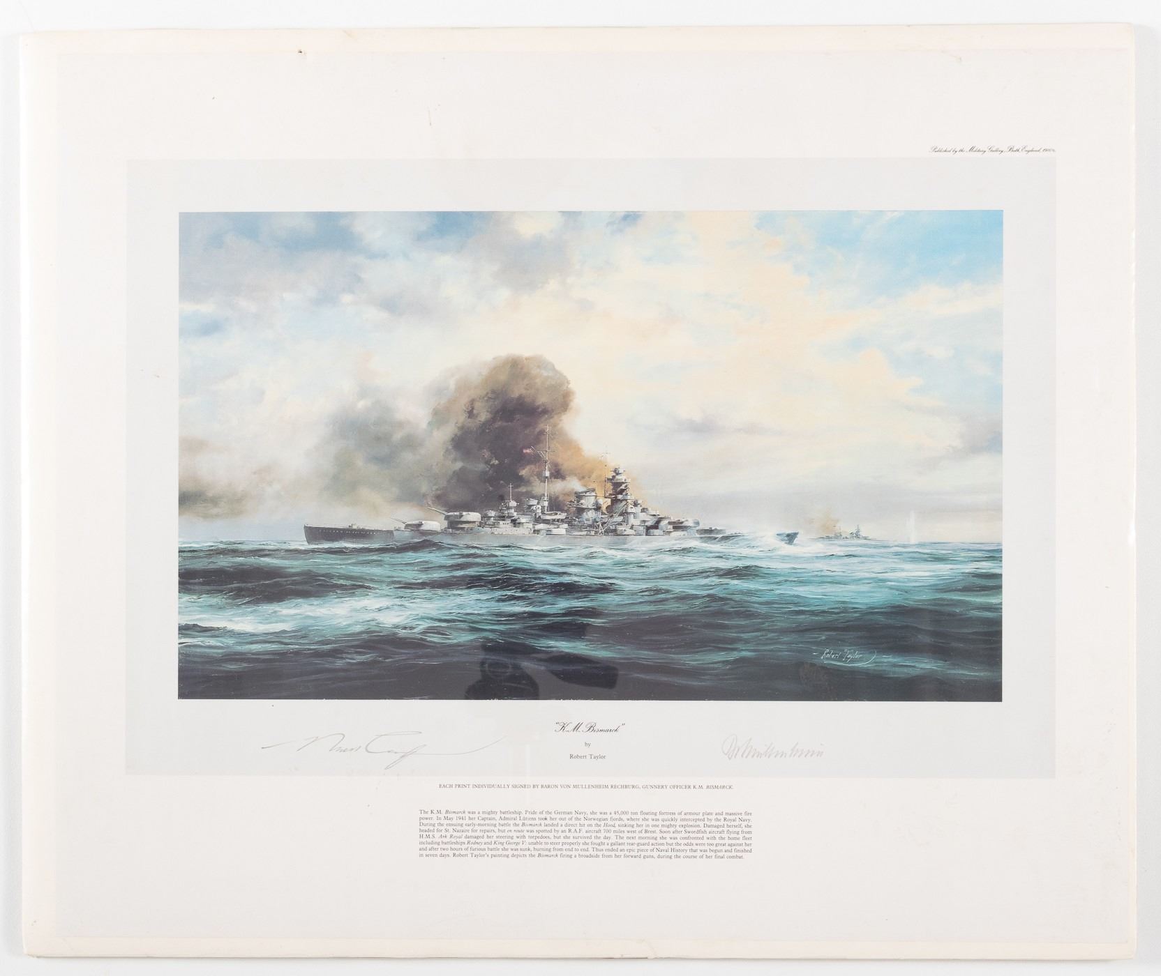 K.M. Bismarck' by Robert Taylor, Military Gallery, Bath, England, 1980, 20 x 24 inches, signed by Robert Taylor and Baron von Mullenheim-Rechberg, gunnery officer for the K.M. Bismarck. The German battleship KM Bismarck was launched in 1939. She was damaged in battle by the HMS Hood and sixteen Fairey Swordfish biplane torpedo bombers and was finally sunk by the battleships Rodney and King George V in May 1941. Baron von Muellenheim-Rechberg (1910-2003) was the highest-ranking survivor of the Bismarck. Minor damage at top edge, otherwise good condition.