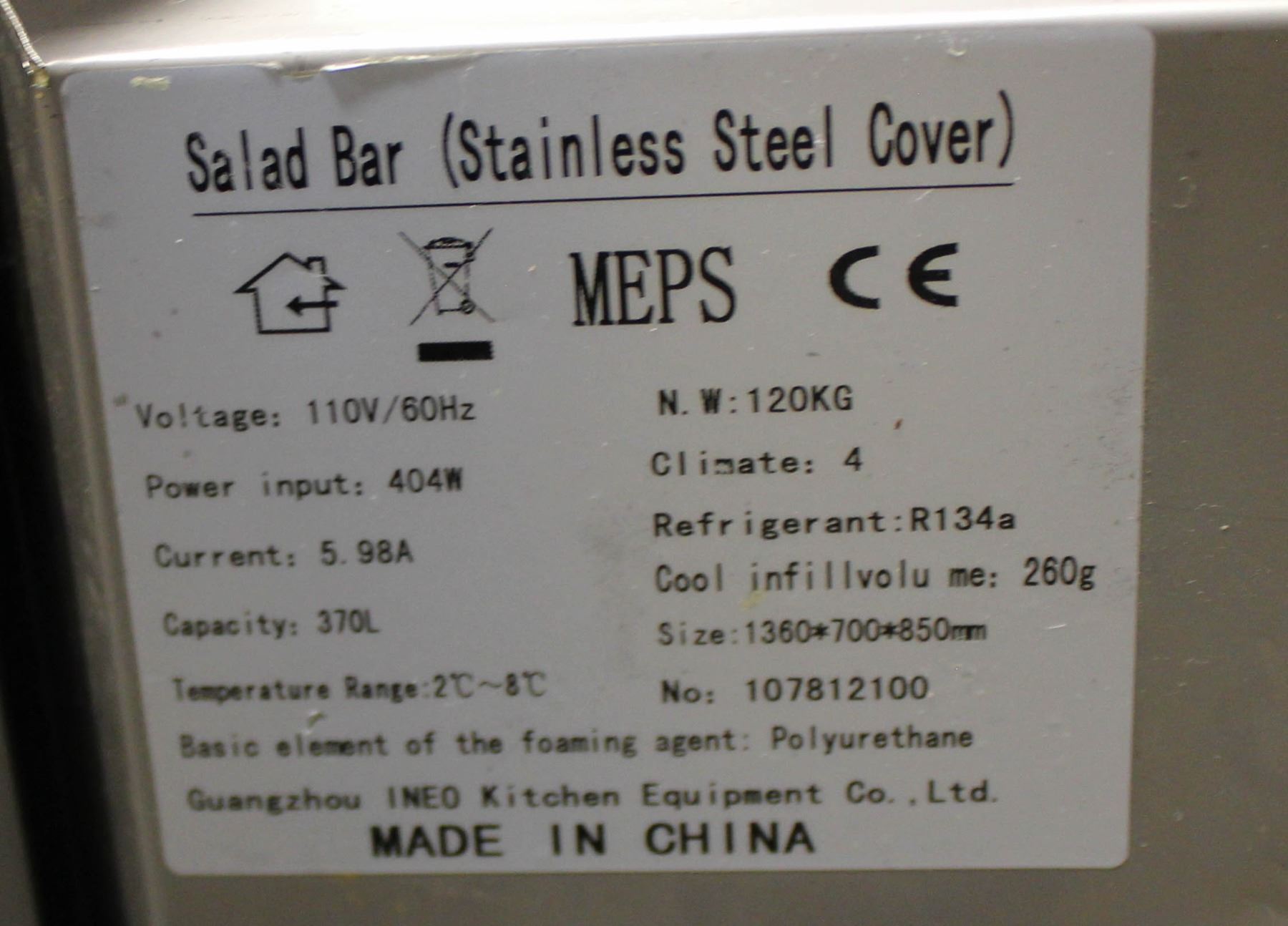 PREP TABLE. 110V, 404W, 5.98AMP, 53.5,27.5,33 INCHES WITHOUT LID