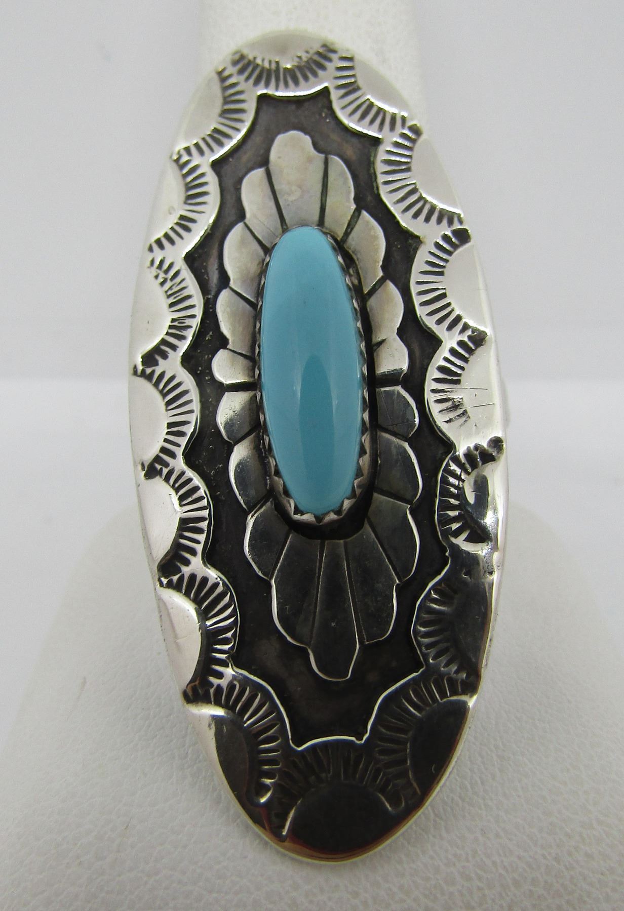 HALLMARKED "KS STERLING" KIRK SMITH OLD PAWN NATIVE AMERICAN SOUTHWEST INDIAN JEWELRY. SIZE 11.5 TOP WITH GEM SLEEPING BEAUTY 48MM BY 33MM. TESTED STERLING SILVER, WEIGHS 10.8 GRAMS. VINTAGE ESTATE USED CONDITION. USA SHIPPING $5.
