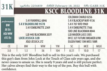 This is the only SAV Bloodline bull to sell in this year’s sale. We purchased this guy’s dam from John Lock at the Touch of Class sale years ago, and she never ceases to amaze us. She is nearly 9 years old and is still picture perfect. Her calves always find their way to the top of the pen. Buy this bull with confidence.