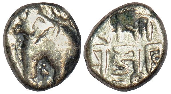 Kakatiyas of Warangal, silver dramma issued in the name of 'Raya Gaja Kesari', (c.1100-1200AD), 1.67g. Obv: elephant standing facing left, traces of lion above. Rev: Nagari legend in three lines Sri Ra /…Ga ja (Ke)/(Sa Ri).