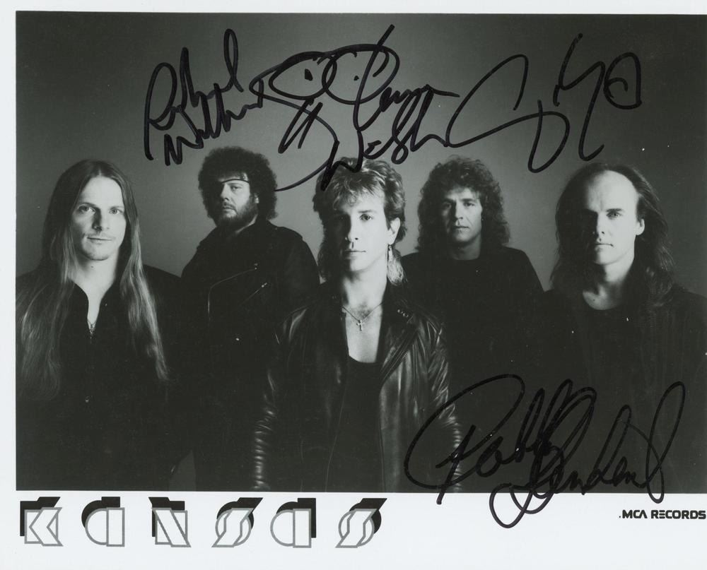 Kansas signed photo autographed by Steve Walsh, Kerry Livgren and Rich Williams 8x10 in. This item is a reprint of an original autograph.