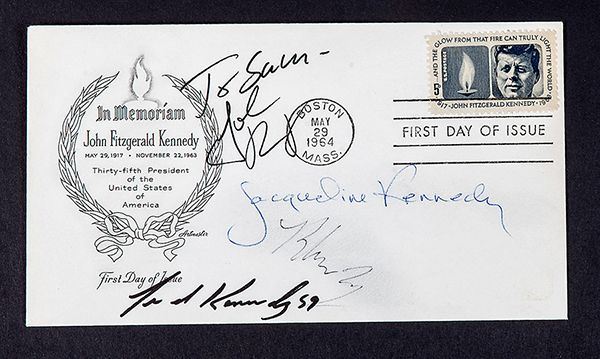 [kennedy Assassination] FDC Signed By Four Kennedys. First Day Cover with "In Memoriam" cachet honoring John Fitzgerald Kennedy, cancelled 29 May 1964, and signed "Jacqueline Kennedy," "R[obert] Kennedy," and "Ted Kennedy 99"; "John Kennedy Jr." signed at the top and inscribed "To Sam." Except for Ted, dates signatures were obtained are unknown. Very fine.