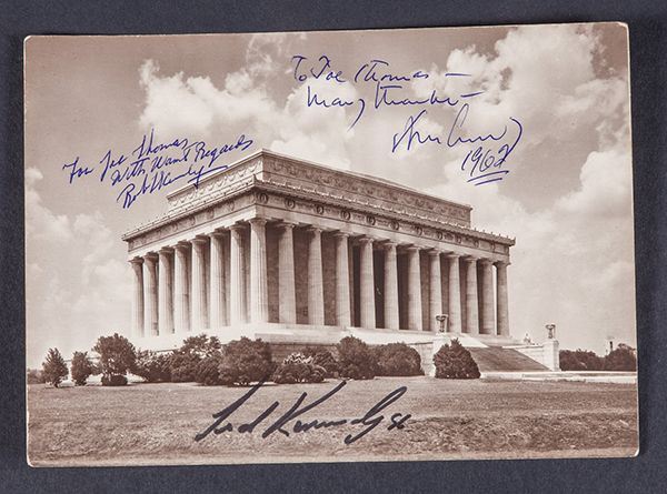 Kennedy, John, Robert, and Ted. 7 x 5 in. black and white photograph of the Lincoln memorial signed and inscribed by President Kennedy, Attorney General Robert Kenney, and Senator Ted Kennedy as follows: