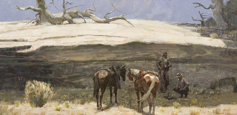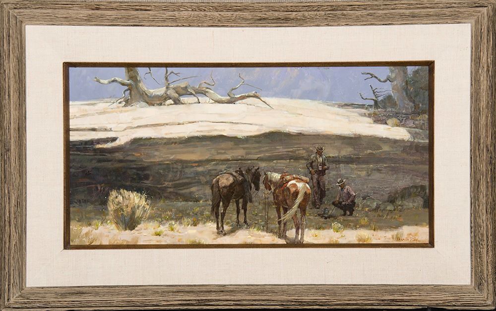 Artist: Kenneth Riley; Title: Untitled (Two cowboys taking a break); Medium: Oil on board; Dimensions: 12 x 24 inches; Signed: Signed and dated 1975 lower right; Framed/Base: 21 x 32 inches