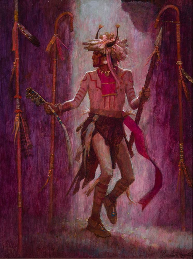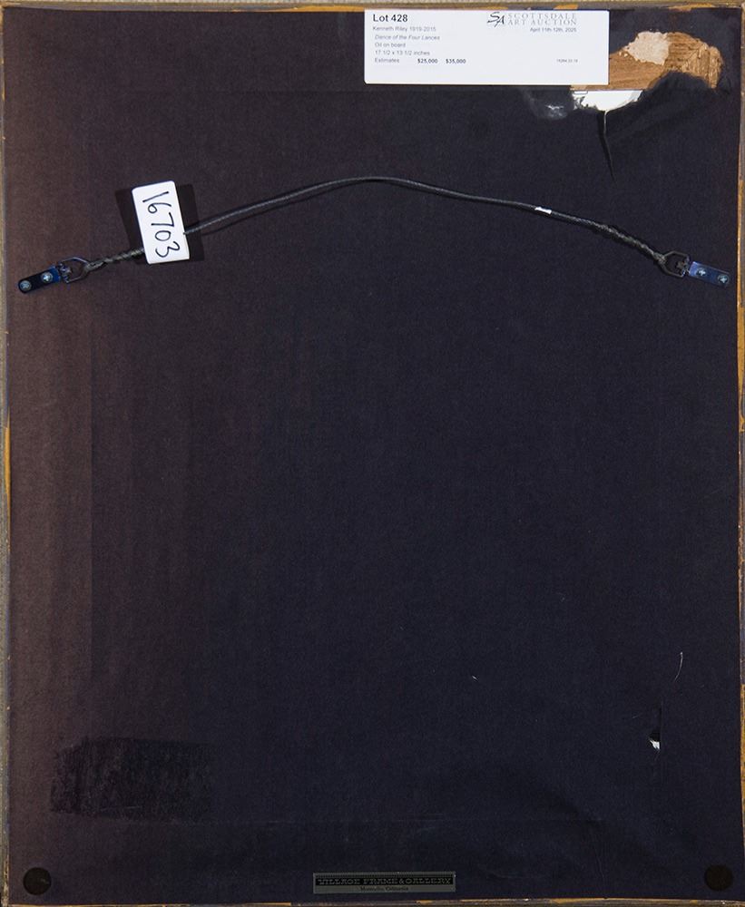 Artist: Kenneth Riley; Title: Dance of the Four Lances; Medium: Oil on board; Dimensions: 17 1/2 x 13 1/2 inches; Signed: Signed lower right; Framed/Base: 23 x 19 inches