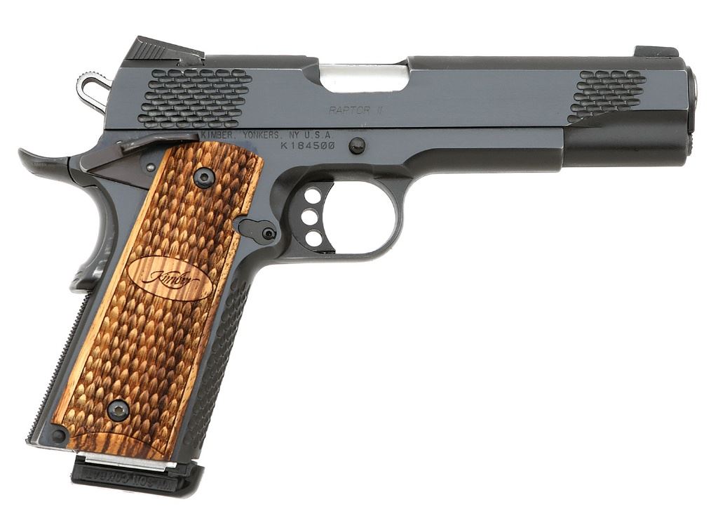 serial #K184500, 45 ACP, 5'' barrel with an excellent bore. This pistol retains about 99% original blue showing light high edge wear and handling marks. The factory hardwood grips feature a series of scales for texture, Kimber logo laser etched on the panels, and remain in excellent condition. This gun features three dot Novaks style night sights that no longer glow, scale texturing on the frontstrap and on the slide, long three-hole trigger with overtravel stop, ambidextrous thumb safeties, and beavertail grip safety with memory bump. It includes an unlabeled factory hard case and an eight-round Wilson Combat magazine with removable floorplate. An excellent 1911-style pistol. (8A11739-83) {MODERN} (800/1200)