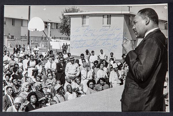King, Martin Luther, Jr (1929-68) Baptist minister; Civil Rights activist; Nobel Laureate. Black and white 10 x 6� in. photo signed and inscribed, "To Ray, God bless you in our struggle for freedom and human dignity. Martin Luther King Jr." Dr. King is pictured in October 1964 urging a group of people in Los Angeles to vote. Signed in blue ball point pen. A note on the verso states that Dr. King signed the photo on April 4, 1967 at the Riverside Church in New York City. The ink is a little light but easily read. Photo has a few small closed edge tears; overall very good.