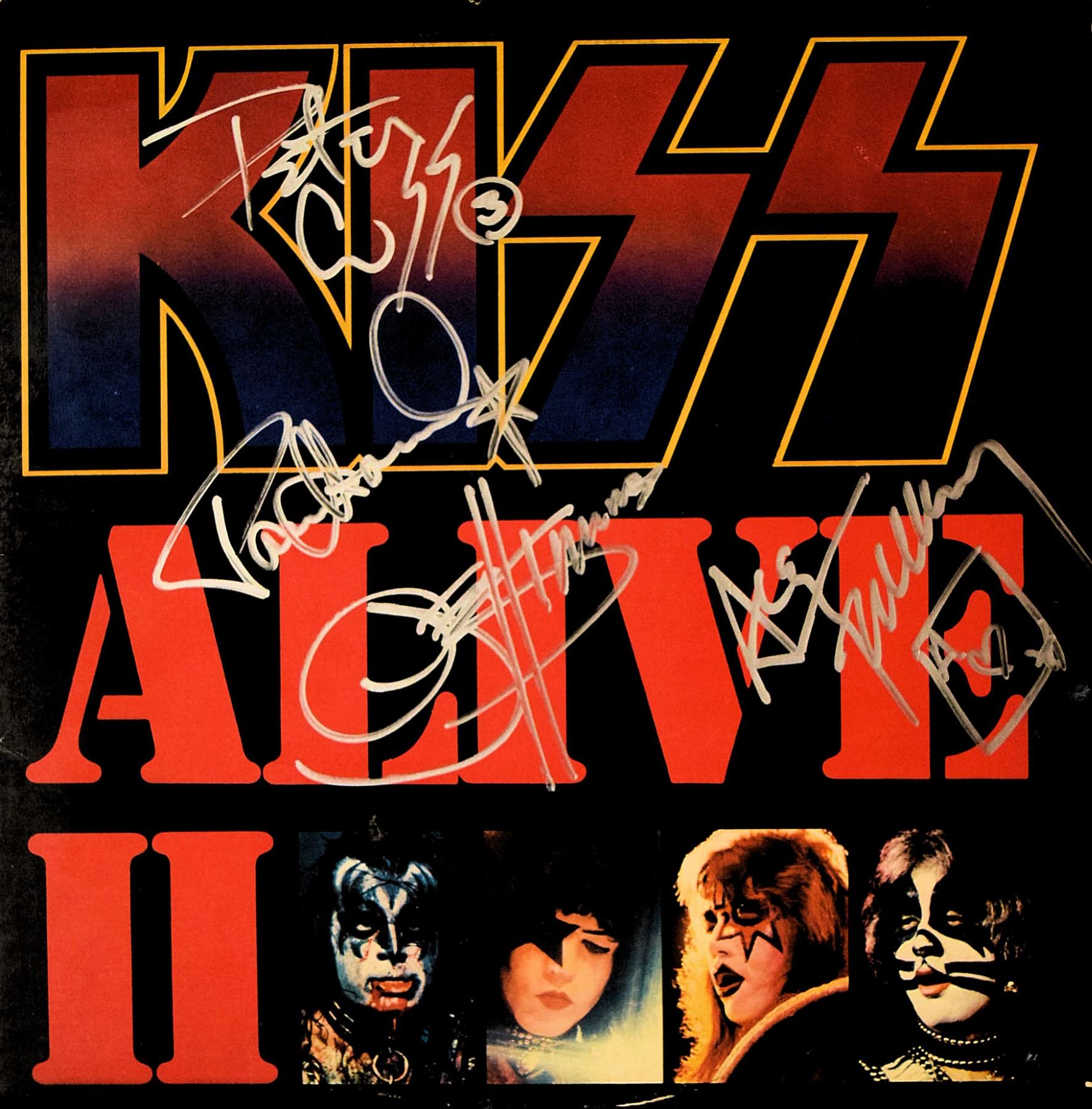 Kiss 1977 Alive II album autographed by Gene Simmons, Paul Stanley, Peter Criss, and Ace Frehley.