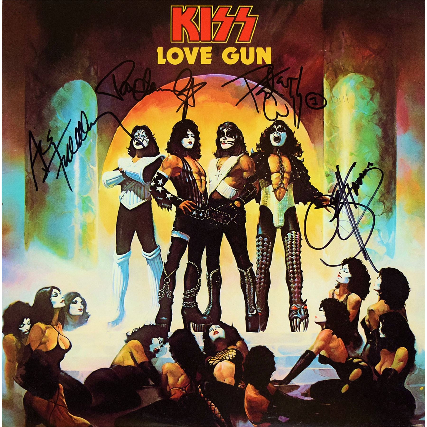 Kiss 1977 Love Gun album. Signed: Gene Simmons, Paul Stanley, Peter Criss & Ace Frehley.