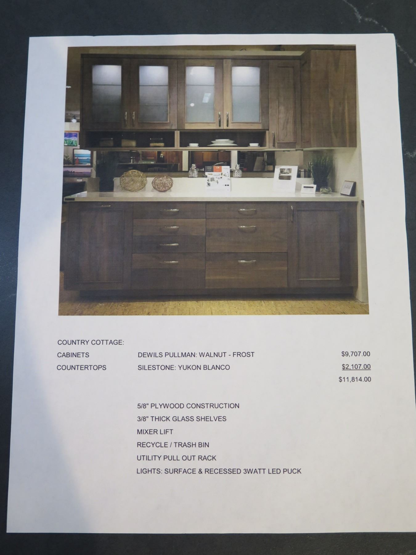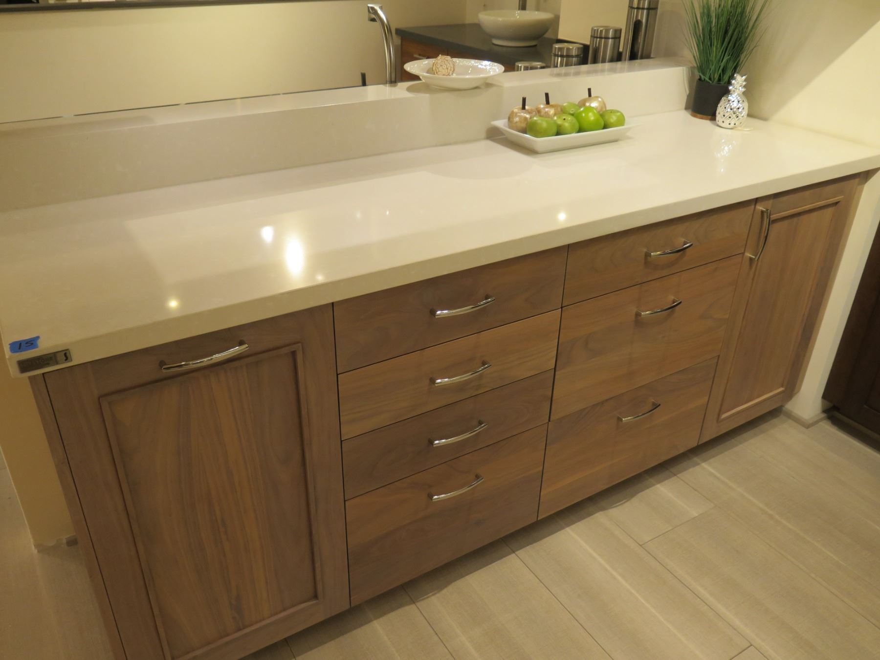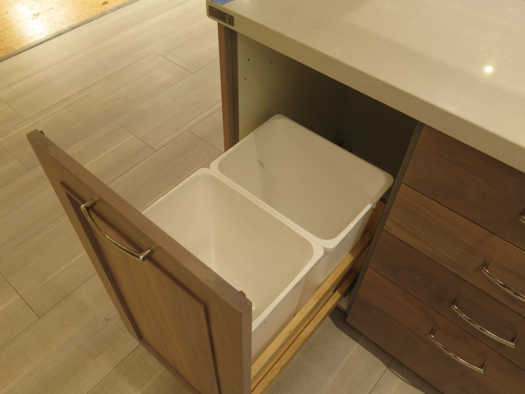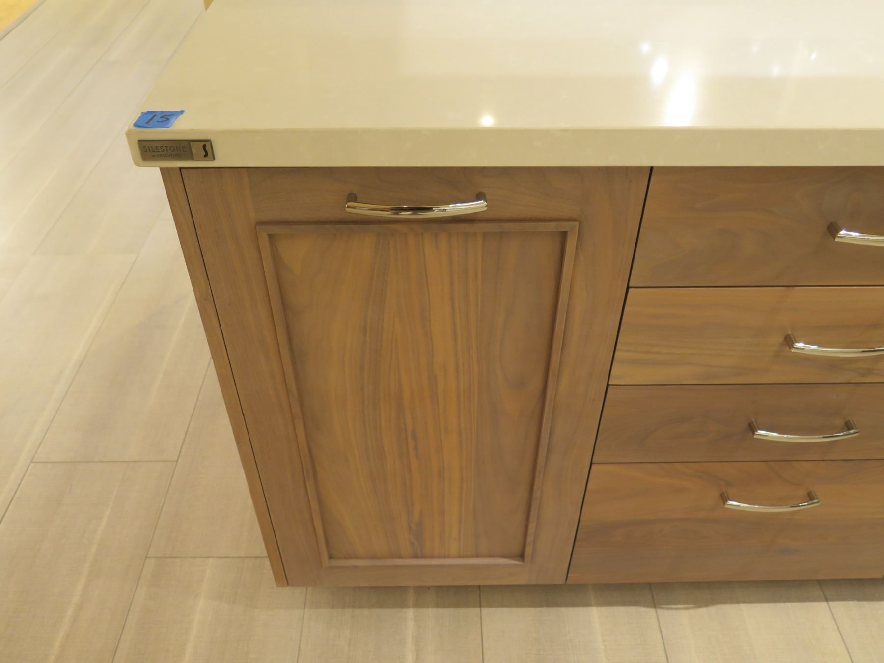 Kitchen Ensemble - Dewils Pullman Walnut Cabinets w/ Recycle Trash Bin Cabinet, Utility Pullout Rack, Silestone Yukon Blanco Counter. 5/8" Plywood construction.