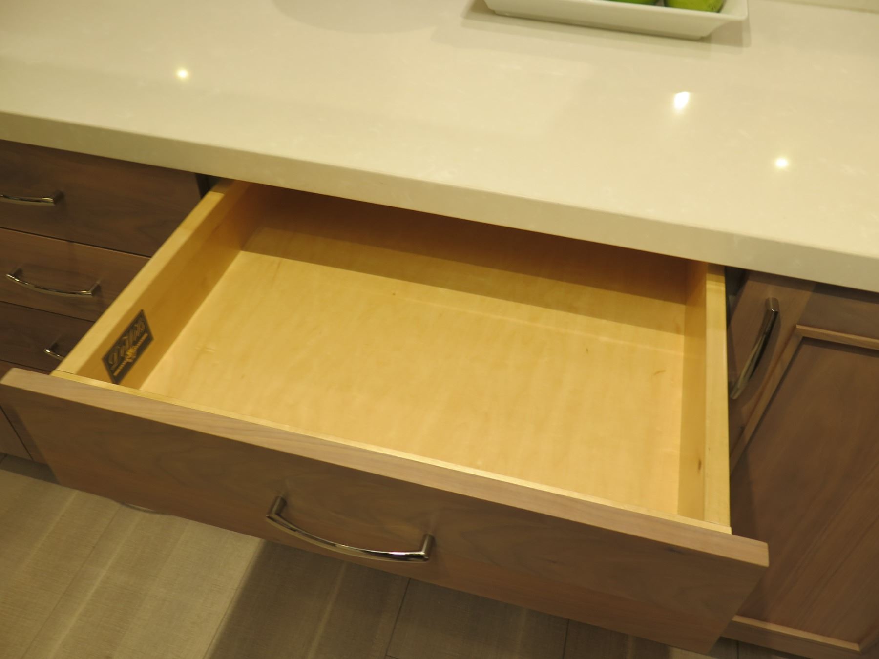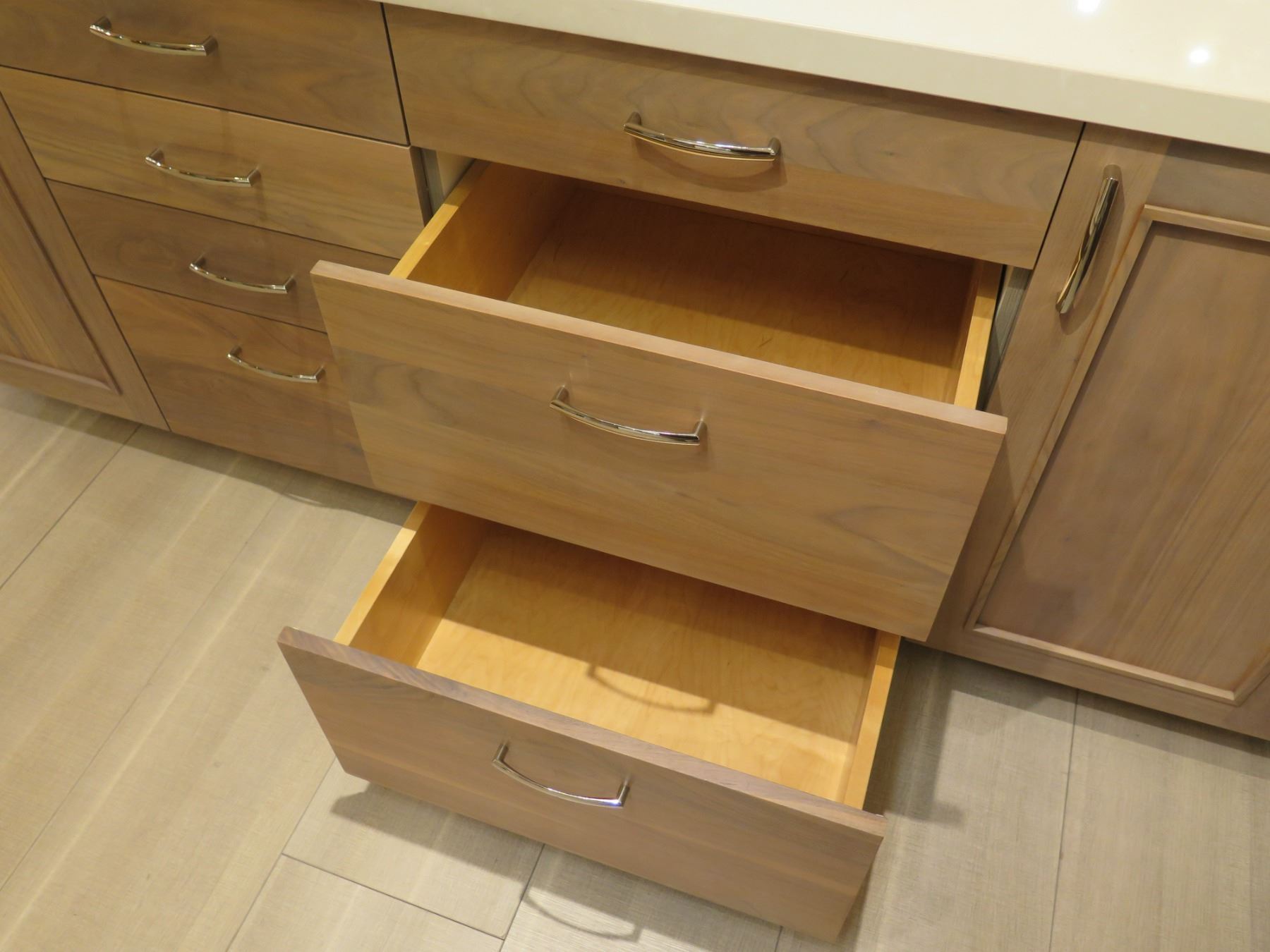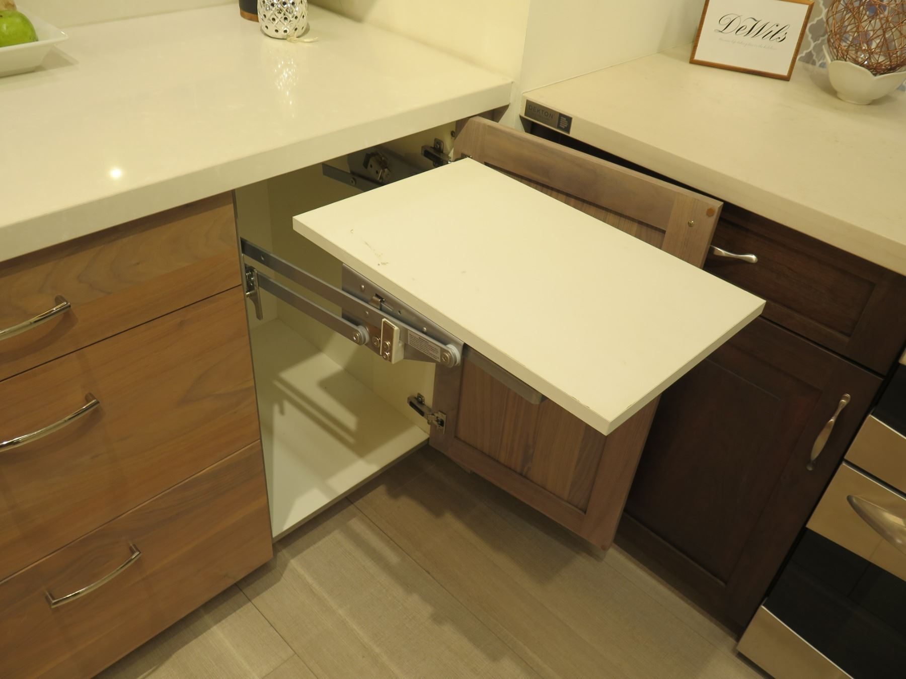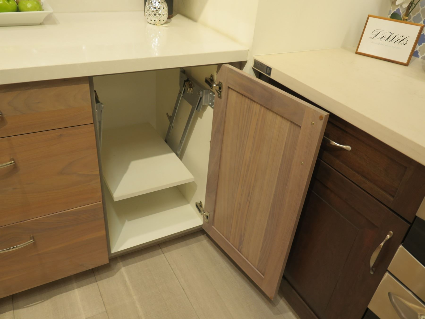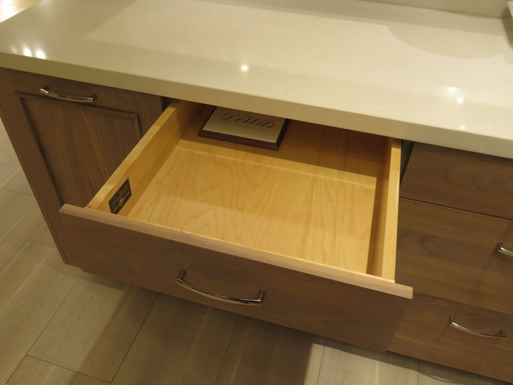Kitchen Ensemble - Dewils Pullman Walnut Cabinets w/ Recycle Trash Bin Cabinet, Utility Pullout Rack, Silestone Yukon Blanco Counter. 5/8" Plywood construction.