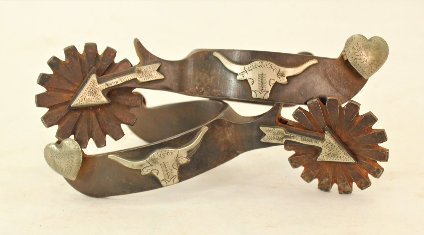 Oversized pair of single mounted spurs with a bullhead and arrowshank motif. Nicely signed and numbered.