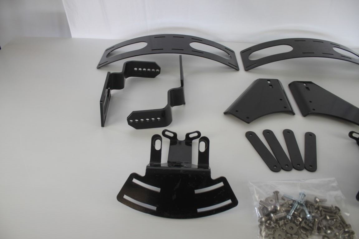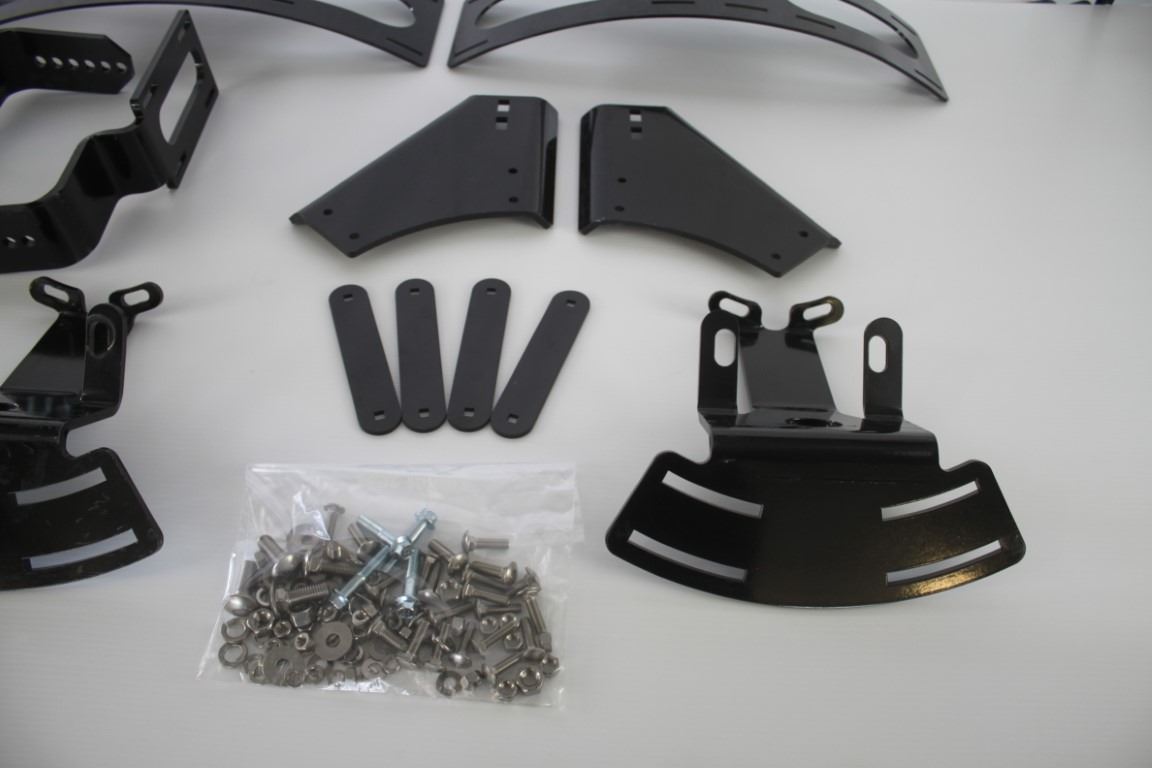 Kubota Front fender bracket kit to fit M5040-M7040-M8540-M9540 series. 2 of each piece, 4 plates, 1 bag of bolts. Poly skins NOT included