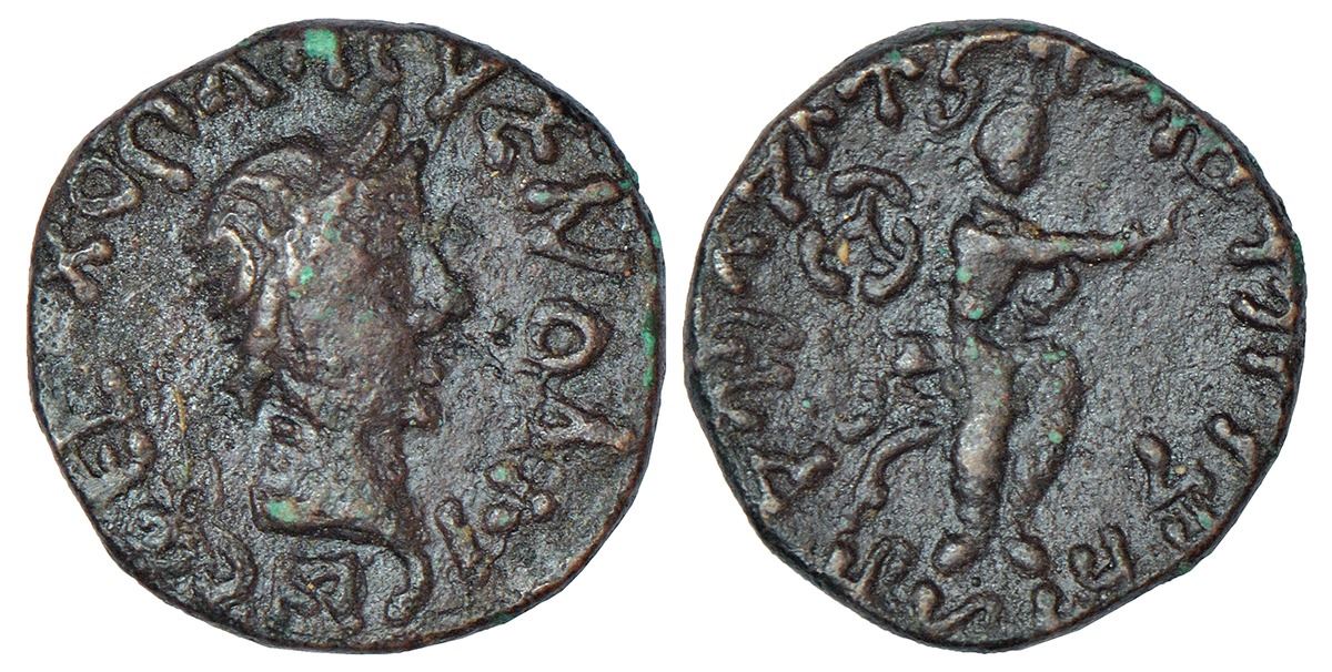 Kushans, copper drachm of Kujula Kadphises (c.30-80 AD), 'Roman head' type, MAC 2875-2879, 3.90g. Obv: bust copying the laurelled head of Roman emperor Tiberius, Bactrian legend KhOShANOU ENODAIPhSES. Rev: king seated in 'curule' chair, raising a sceptre, monogram in left field; Kharoshthi legend Kushanasa Yauasa Kuyula Kaphsasa Sachadhramatidasa around.