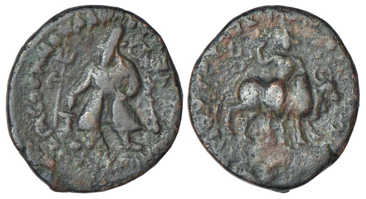 Kushans, copper quarter unit of Wima Kadphises (c.110-127 AD), MAC 3053-3054, 3.96g. Obv: king standing, wearing tunic and hard boots, offering sacrifice at a Shaivite altar, with club by his elbow and Tamgha next to it; Bactrian legend BASILEOS BASILEON SOTER MEGAS OOEMO KADPhISES, partially visible around. Rev: Shiva standing reclining against Nandi, Nandipada in left field; traces of Kharoshthi legend around.