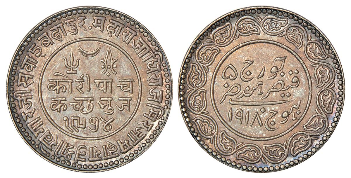 Kutch, Khengarji III/George V (1875-1942 AD), silver 5 kori, VS 1974/AD 1918, DR-K 233.16, 13.88g.