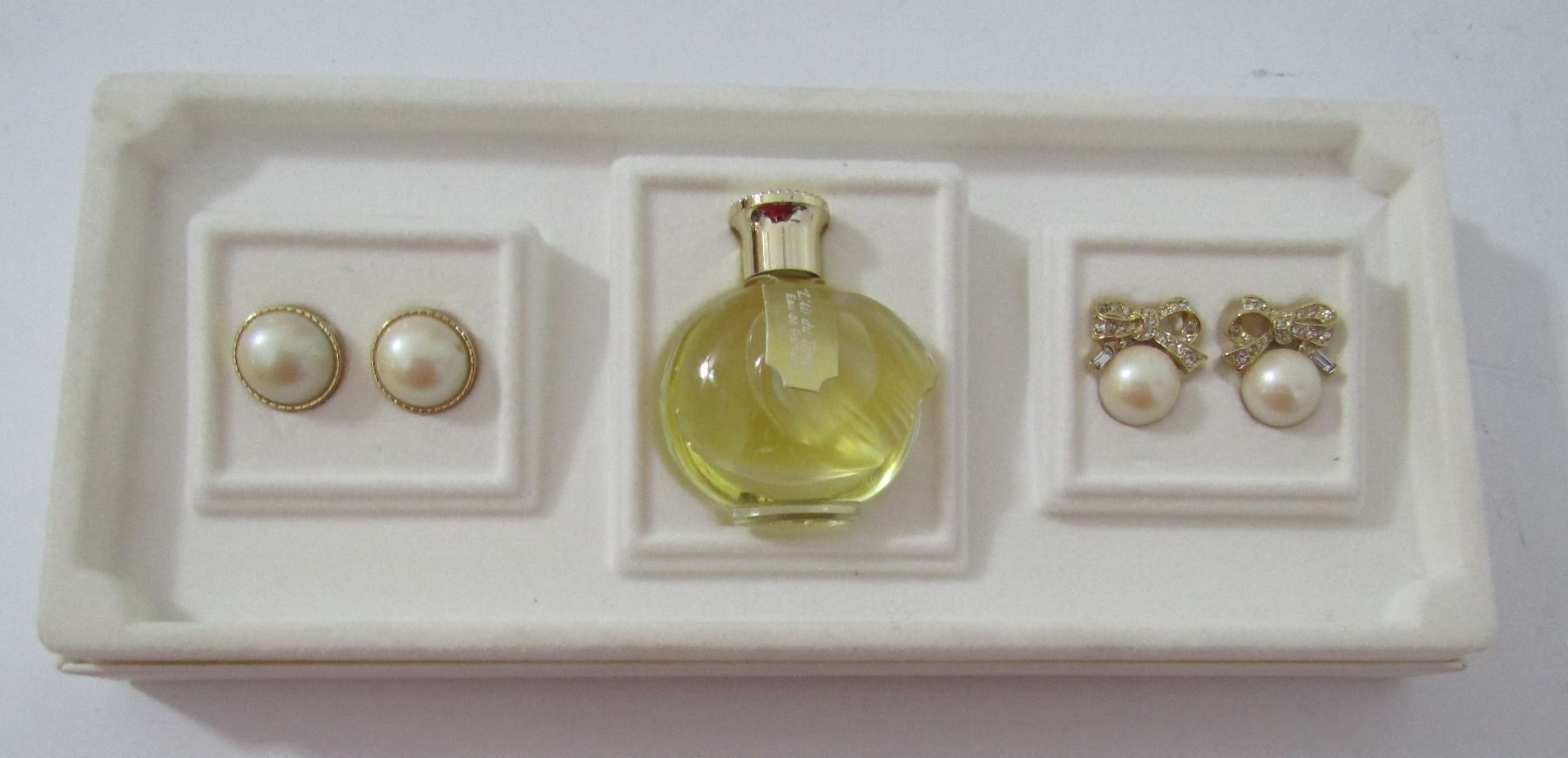 NEW IN BOX, OLD STOCK. 2 PAIR OF CLASSIC PEARL EARRINGS PLUS EAU DE PARFUM FLACON .33FL OZ. OUTER BOX DISCOLORED A BIT, INNER BOX EXCELLENT. USA SHIPPING $10.