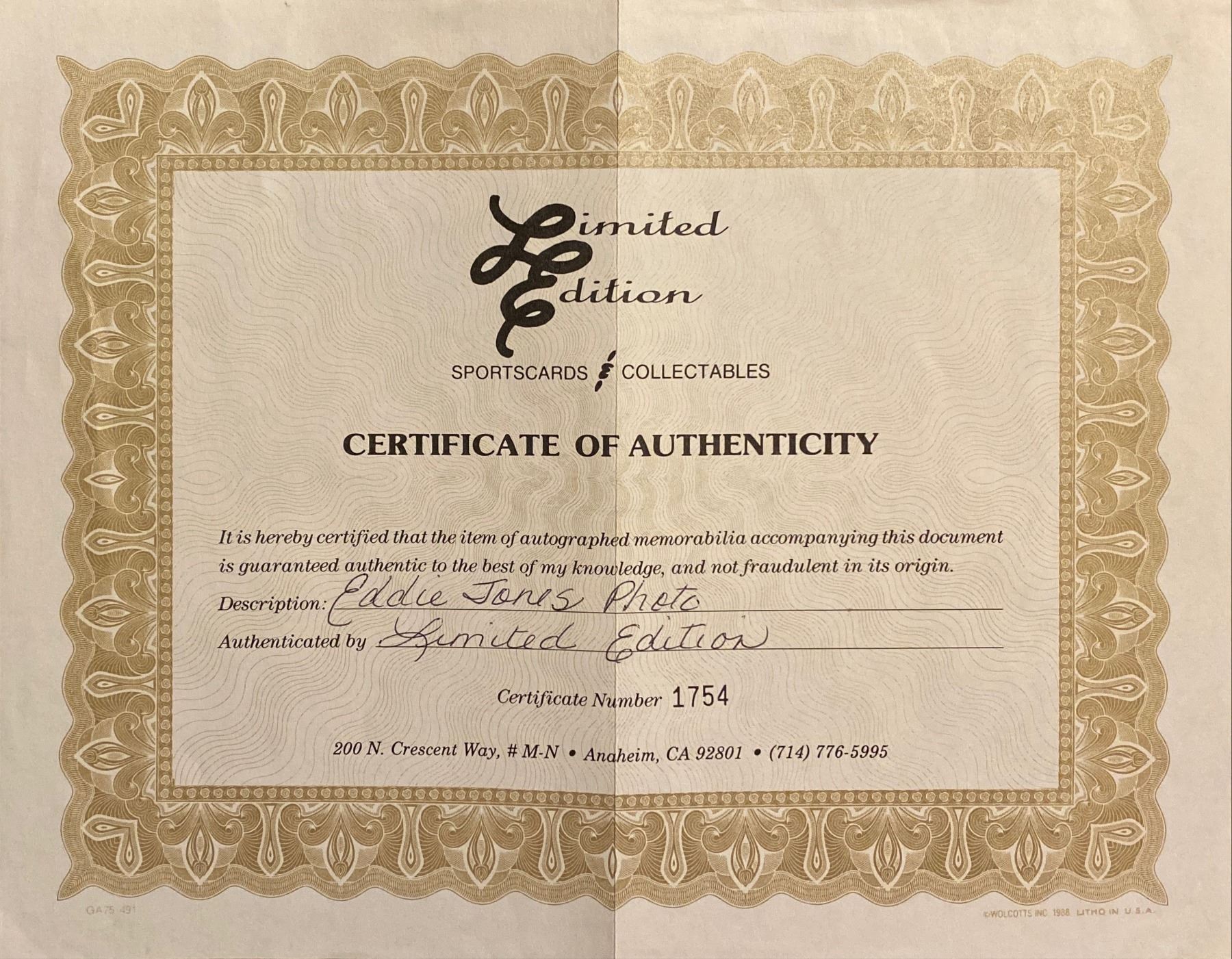 Autographs are certified by a 20 year plus member of IADA (International Autograph Dealers Association) , UACC (Universal Autograph Collectors Club), IACC - International Autograph Collector Club), Manuscript Society, SAG (Screen Actors Guild), Southern California Motion Picture Council, APS (American Philatelic Society), ASCC (American Society Of Check Collectors), AFDCS (American First Day Cover Society), Hollywood Heritage Museum, and the Golden State Boxing Association. Additionally a memb