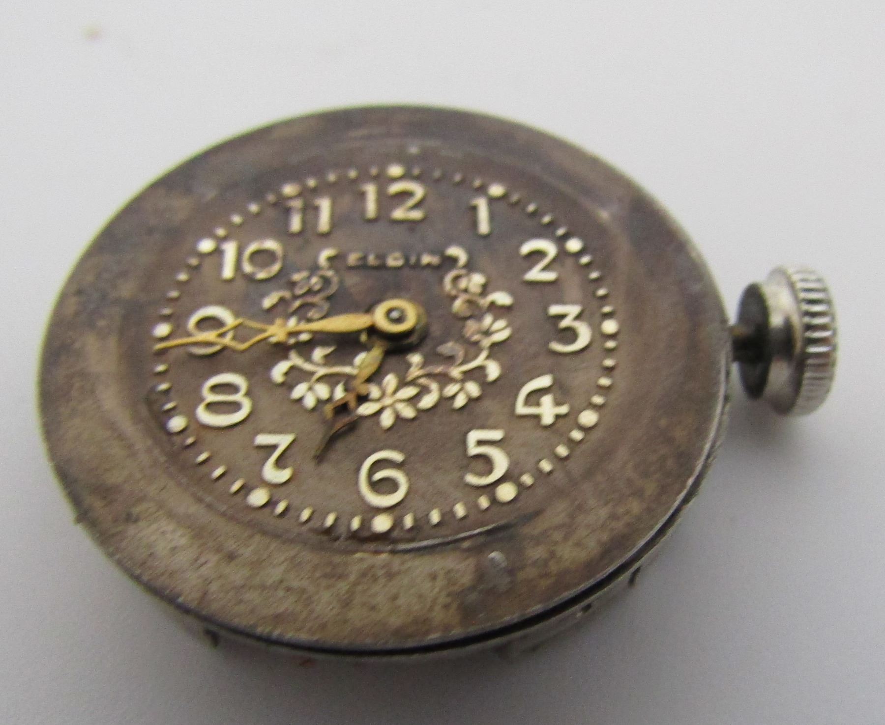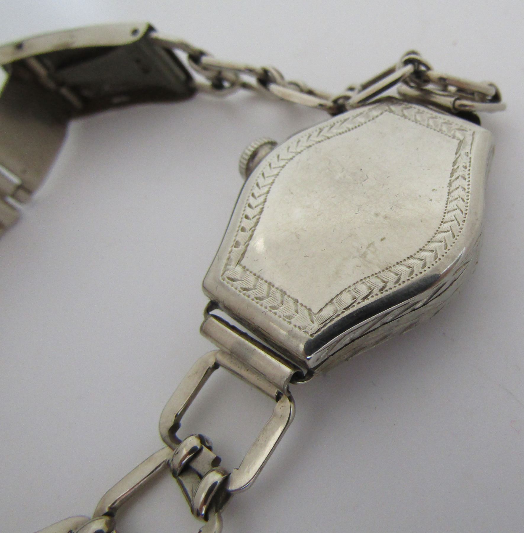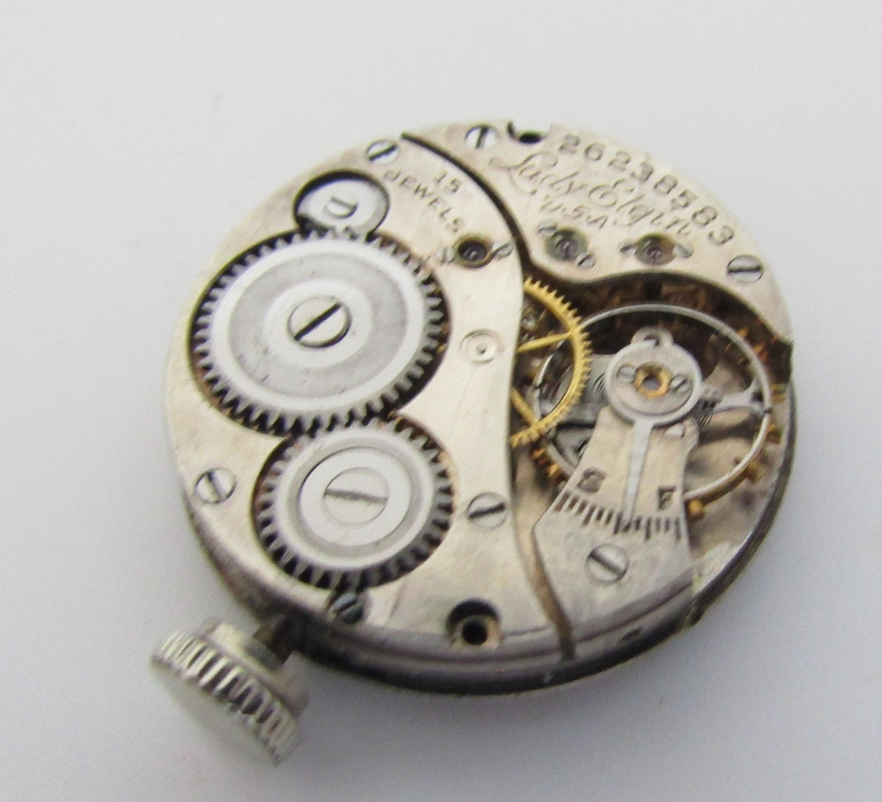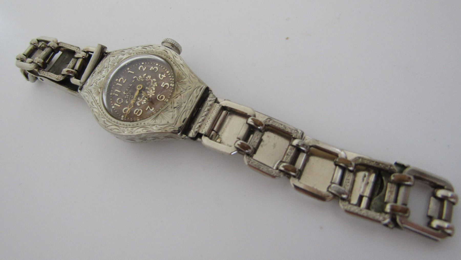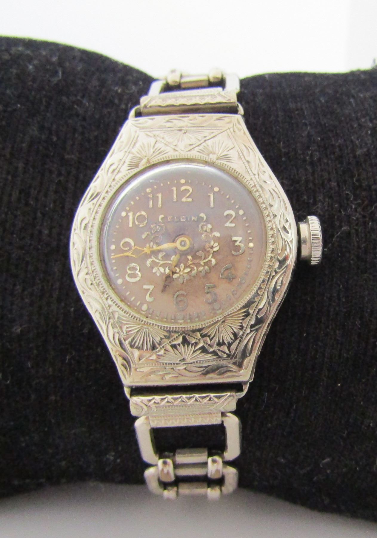 ANTIQUE VINTAGE ESTATE ENGRAVED LADY ELGIN WATCH CO. SOLID 14K WHITE GOLD WATCH 27MM X 21MM. WHITE GOLD FILLED BAND 7.4MM WIDE, ADJUSTABLE 7 TO 8 INCH WRISTS. WEIGHS 25.3 GRAMS TOTAL. USA SHIPPING $5.
