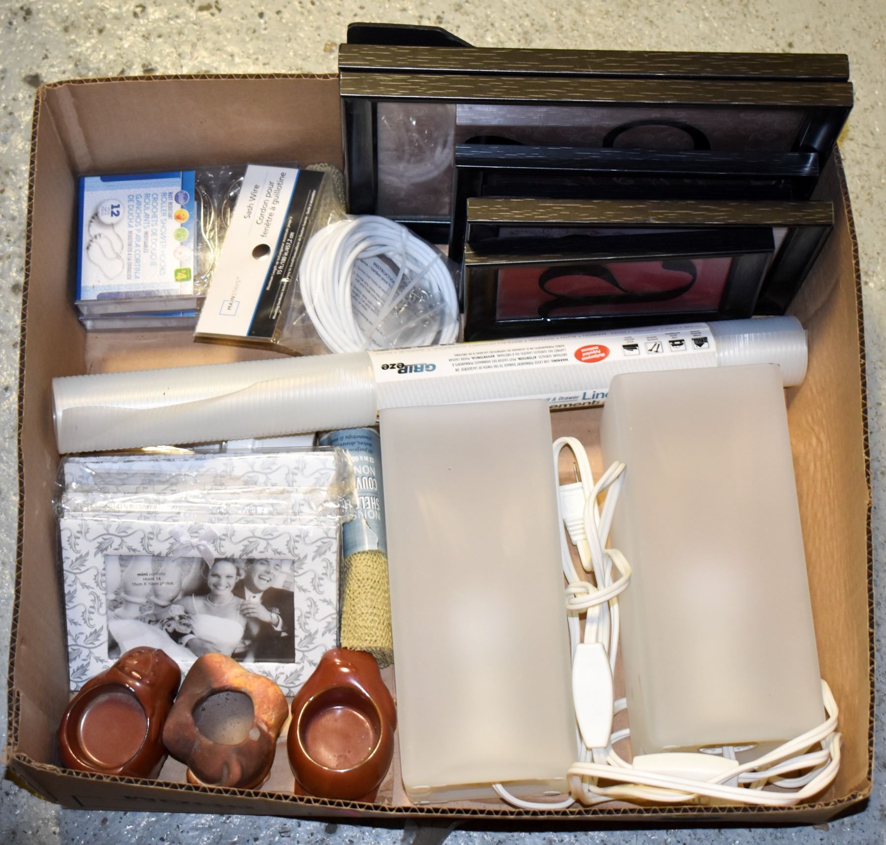 INCL. 2 OPAQUE GLASS CUBE ACCENT LIGHTS, ELEPHANT TEALIGHTS, 2 NEW DRAWER LINER ROLLS, 3 NEW PICTURE MINI PORTFOLIOS, 2 NEW PACKS OF SHOWER CURTAIN HOOKS, 5 PICTURE FRAMES, ETC.