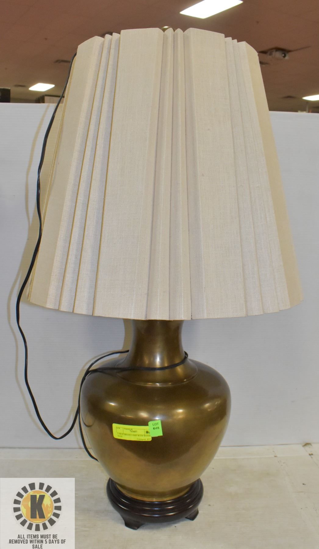 LARGE BRASS LAMP WITH WOOD BASE H-34"