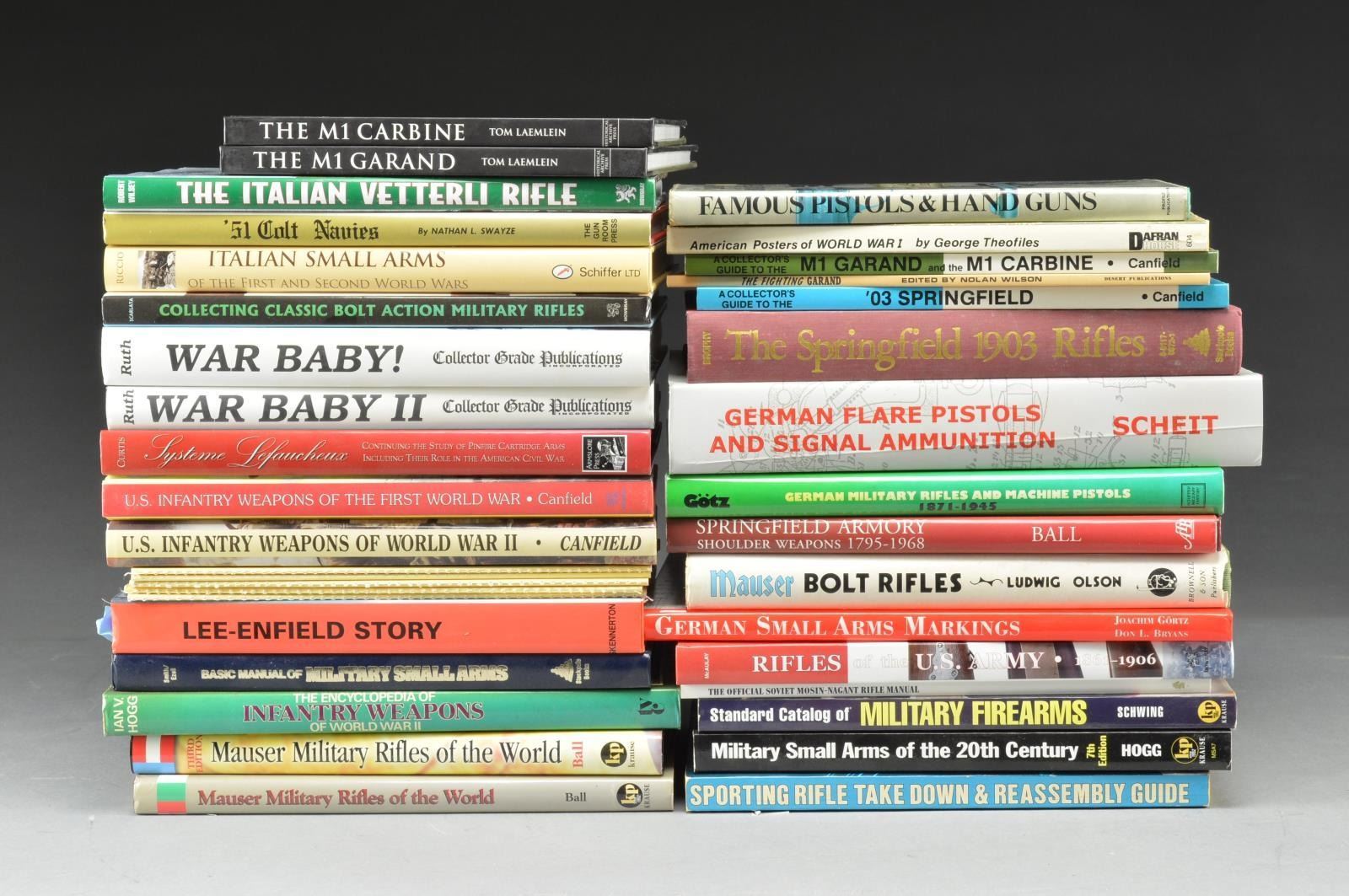Notable titles include: War Baby & War Baby II by Ruth. Collector grade publications. / Mauser Military Rifles of the World by Ball. / The Lee-Enfield Story by Skennerton. / '51 Colt Navies by Swayze. / The Peacemakers by Wilson. / Mauser Bolt Rifles by Olson. / German Flare Pistols and Signal Ammunition by Scheit. / German Military Rifles and Machine Pistols by Gotz. / Rifles of the U.S. Army 1861-1906 by McAulay. / Russian Helmets by Clawson. / The Paterson Colt Book by Wilson. / Systeme Weapons 1795-1968 by Ball. / The Springfield 1903 Rifles by Brophy. / Lugers at Random by Kenyon. CONDITION: ranges from good to very good. Majority have clean dust jackets & tight bindings but some may have loose spines, edge wear & staining. (02-16438-1/RW). $600-800.