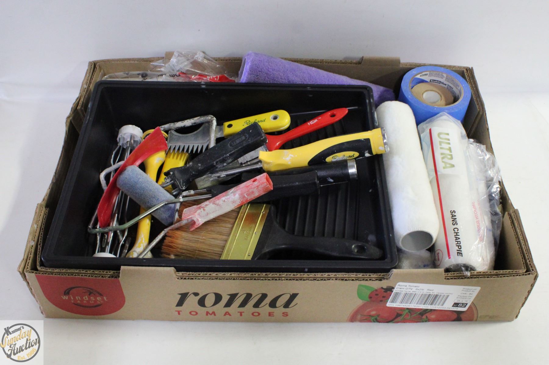 LARGE PAINTERS LOT (TAPE, TRAY, ROLLERS, BRUSHES)