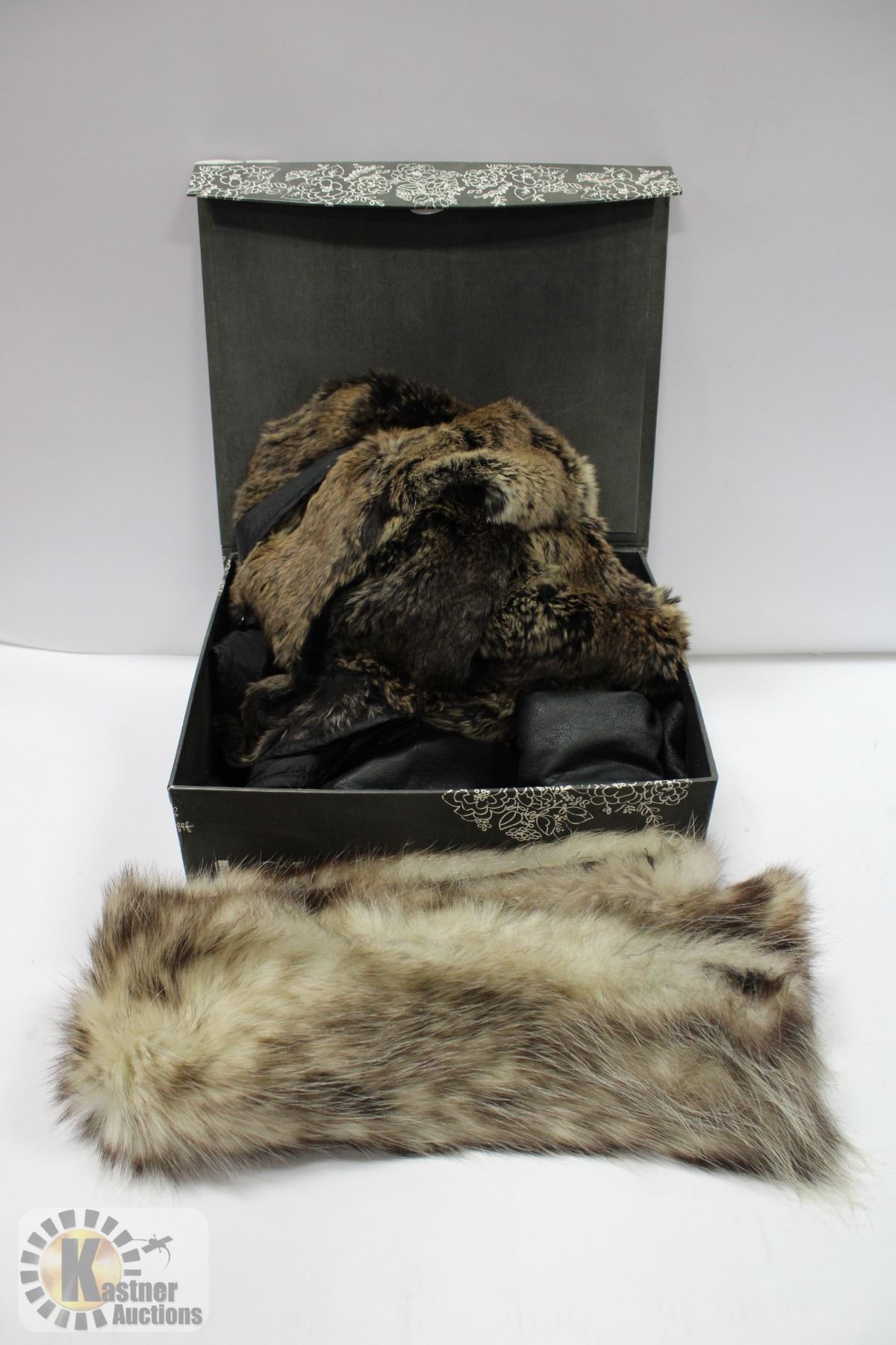 LEATHER LONG SKIRT, FUR VEST AND FUR COLLAR IN BOX