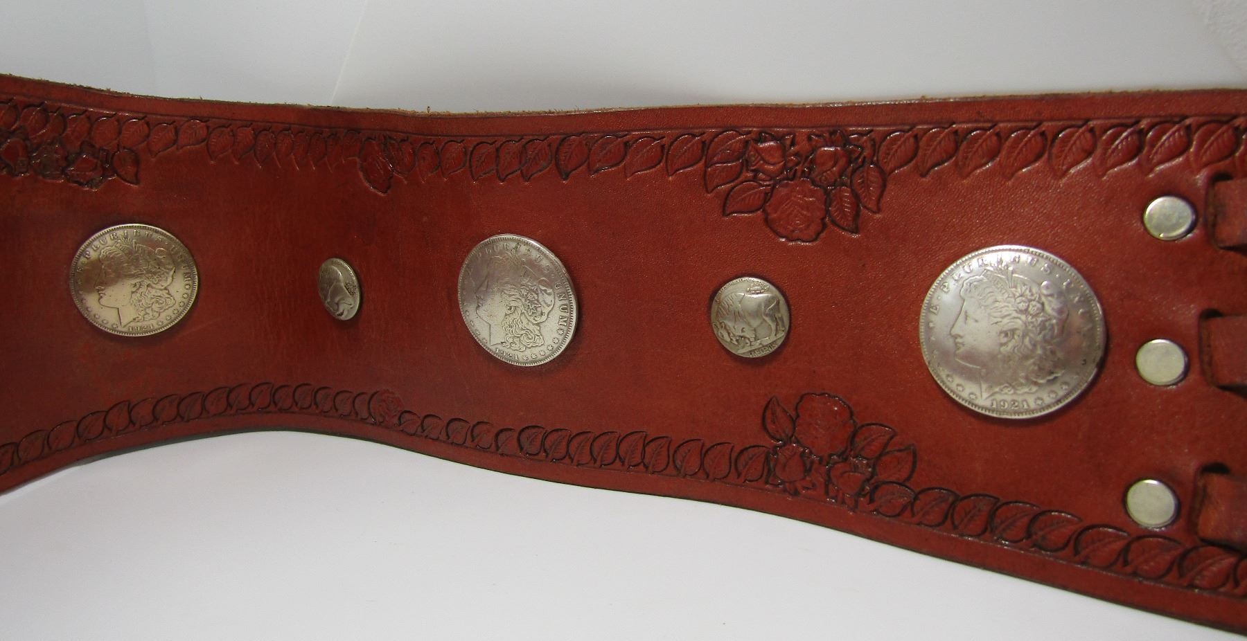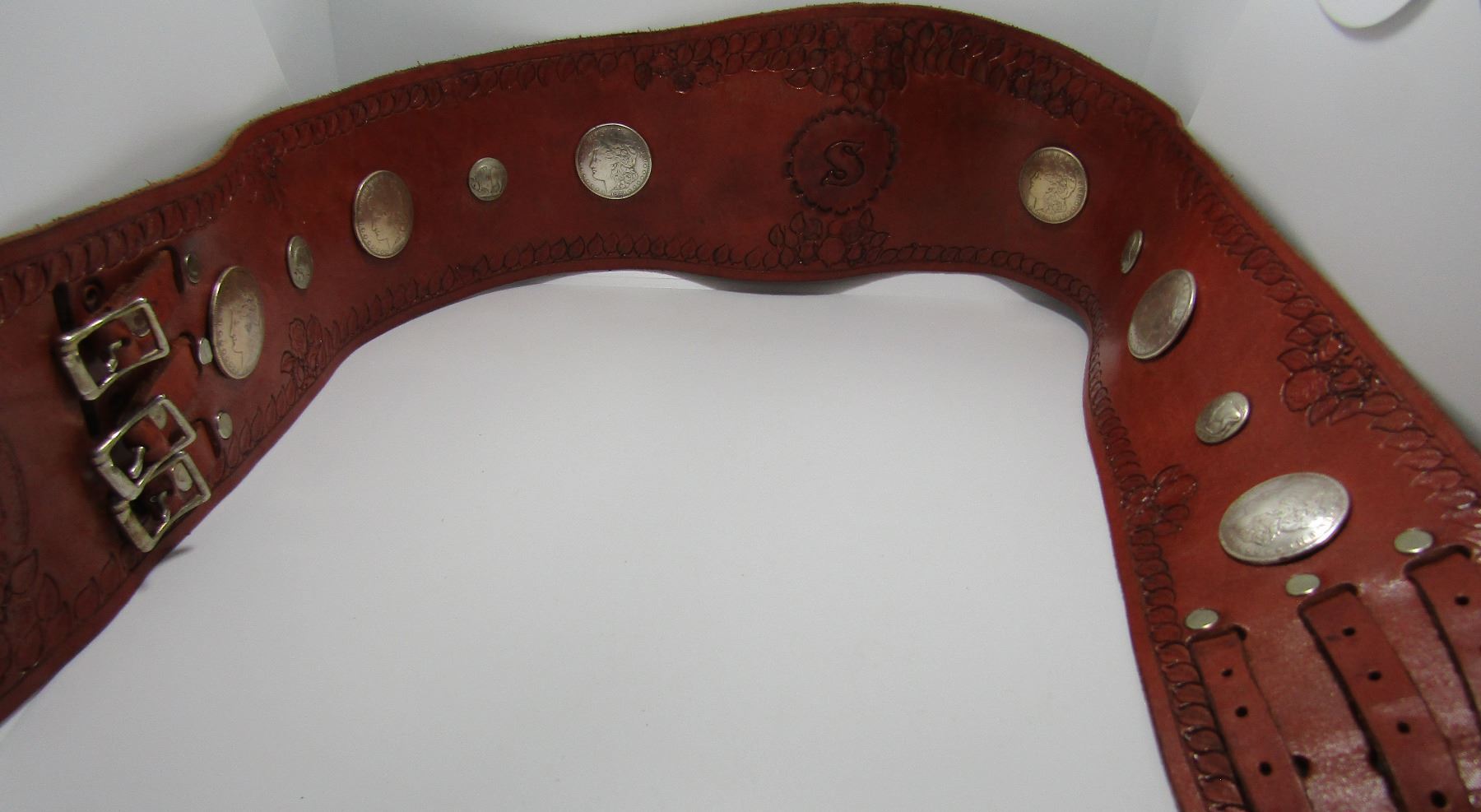 EXCELLENT CONDITION VINTAGE ESTATE COWBOY OR COWGIRL WESTERN WEAR. MORGAN DOLLAR AND BUFFALO NICKEL LOOK A LIKES. GENUINE LEATHER SIGNED "A.C. THOMPSON MAKER GRAND FORKS, ND." ENGRAVED "S". HAS 3 BUCKLES.ALL THE METAL PIECES ARE SILVERPLATE. HUGE 5.5" WIDE AND MEASURES 42" LONG. FITS 35.5" TO 39" WAIST. USA SHIPPING $10