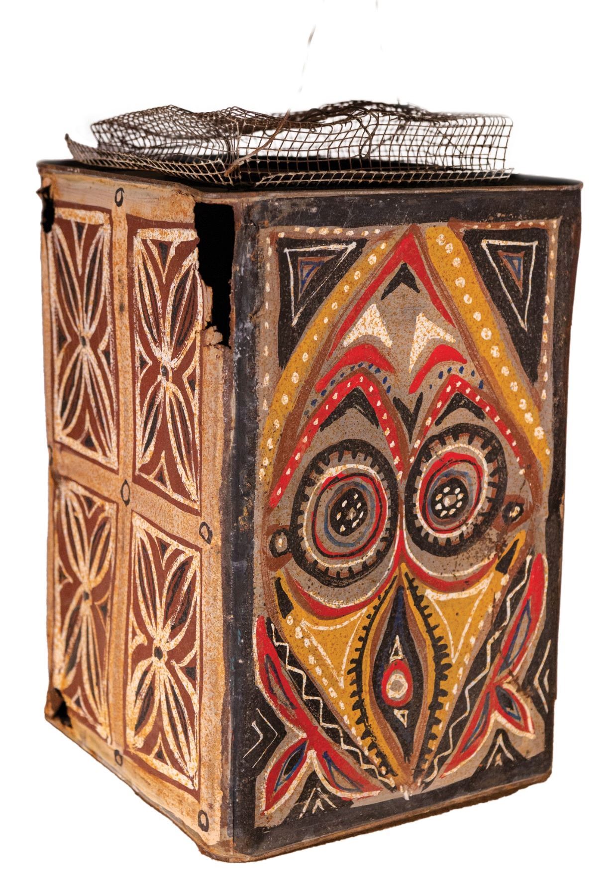 (1980s) This is a series of incredible case studies in LeRoy Schmaltz found object artwork. Here, LeRoy took cast aside oil cans, reconfigured them as candle lanterns and painted them in various Polynesian and other themes. Each can in the following lots are fully painted on all sides by LeRoy Schmaltz. Approx 15"x10"x10". VG+ with typical wear.