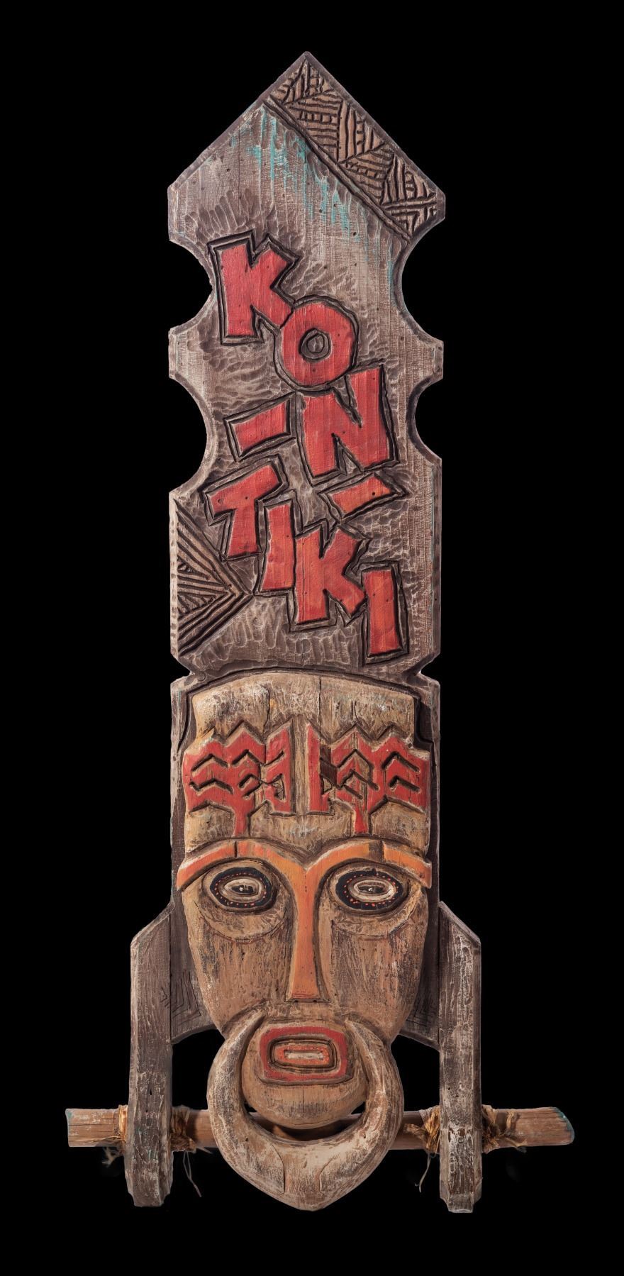 (1980s) Another figural wall carving by LeRoy Schmaltz. This one based on the design and logo from the book recounting the adventures of Thor Heyerdahl. 47”x22” VG+ with typical wear.