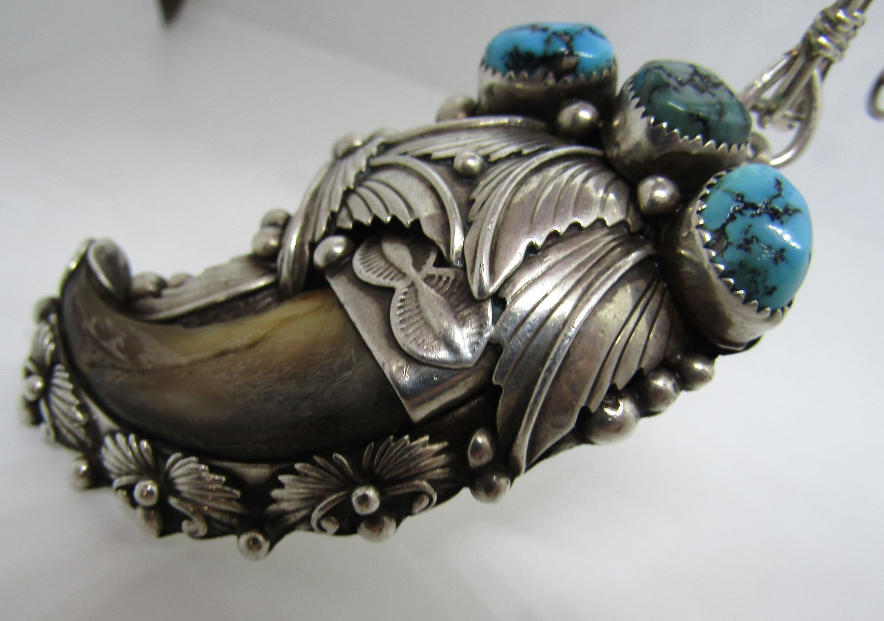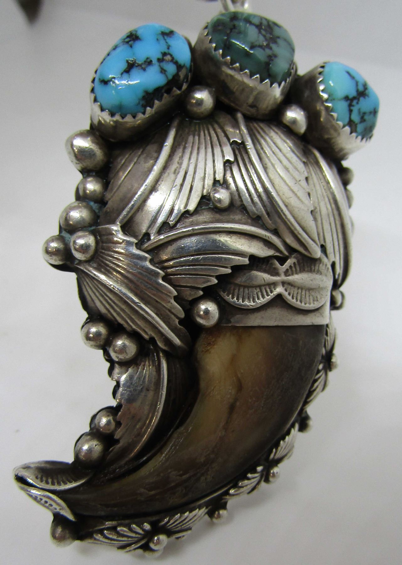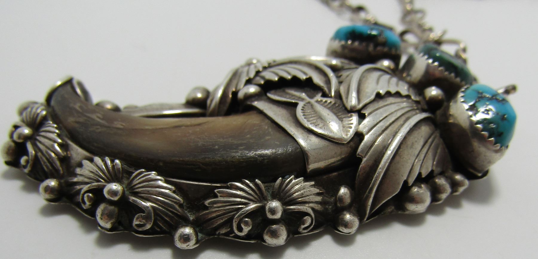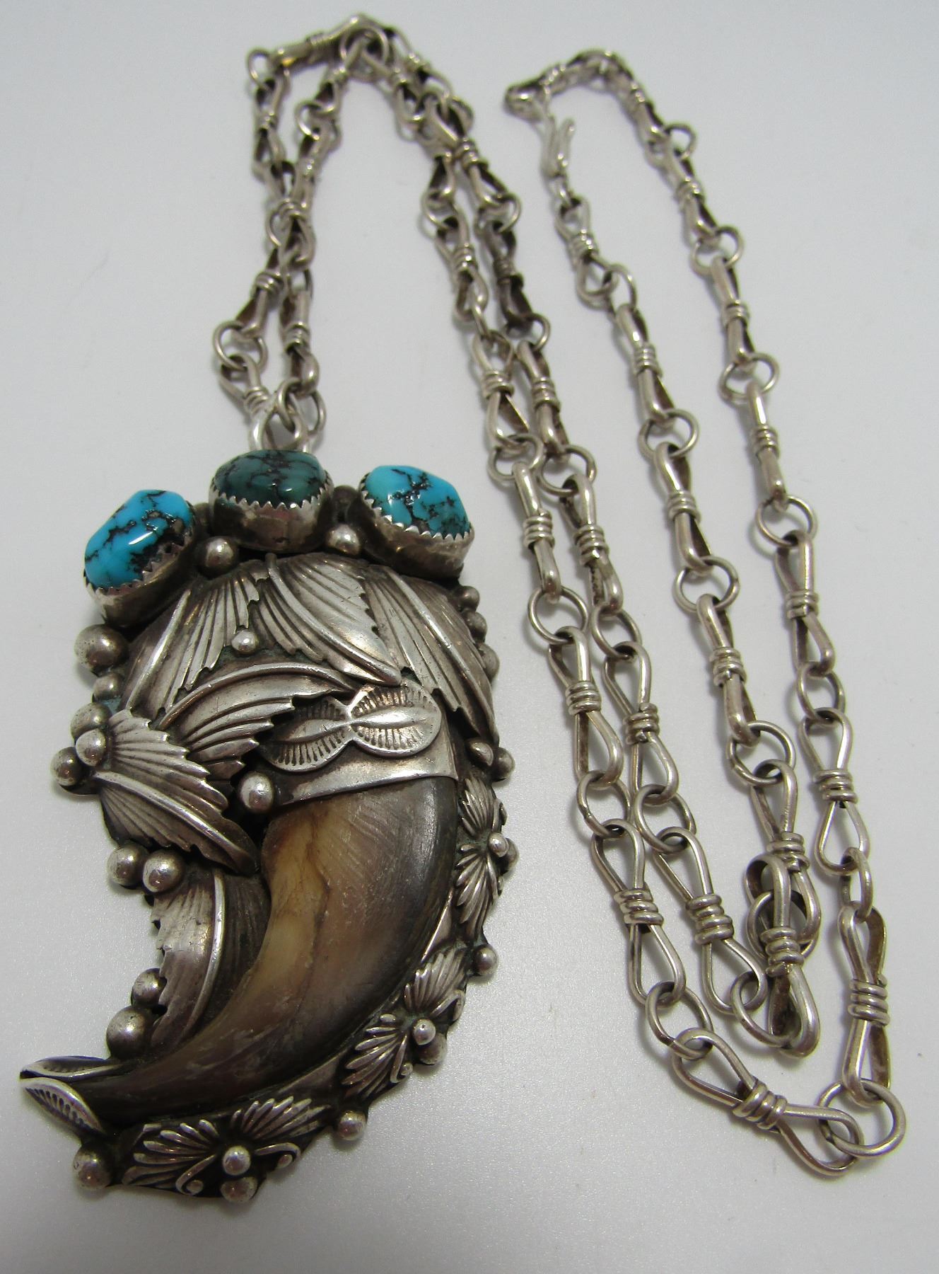 ELABORATE OLD PAWN PENDANT MARKED "LES CRAIG". PLUS 32" HAND MADE STERLING SILVER LINK CHAIN. NATIVE AMERICAN SOUTHWEST NAVAJO INDIAN JEWELRY. HUGE 68MM BY 43MM. WEIGHS 72.7 GRAMS. VINTAGE ESTATECONDITION. USA SHIPPING $10.