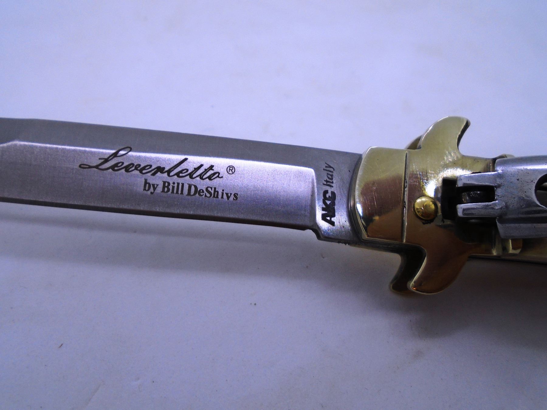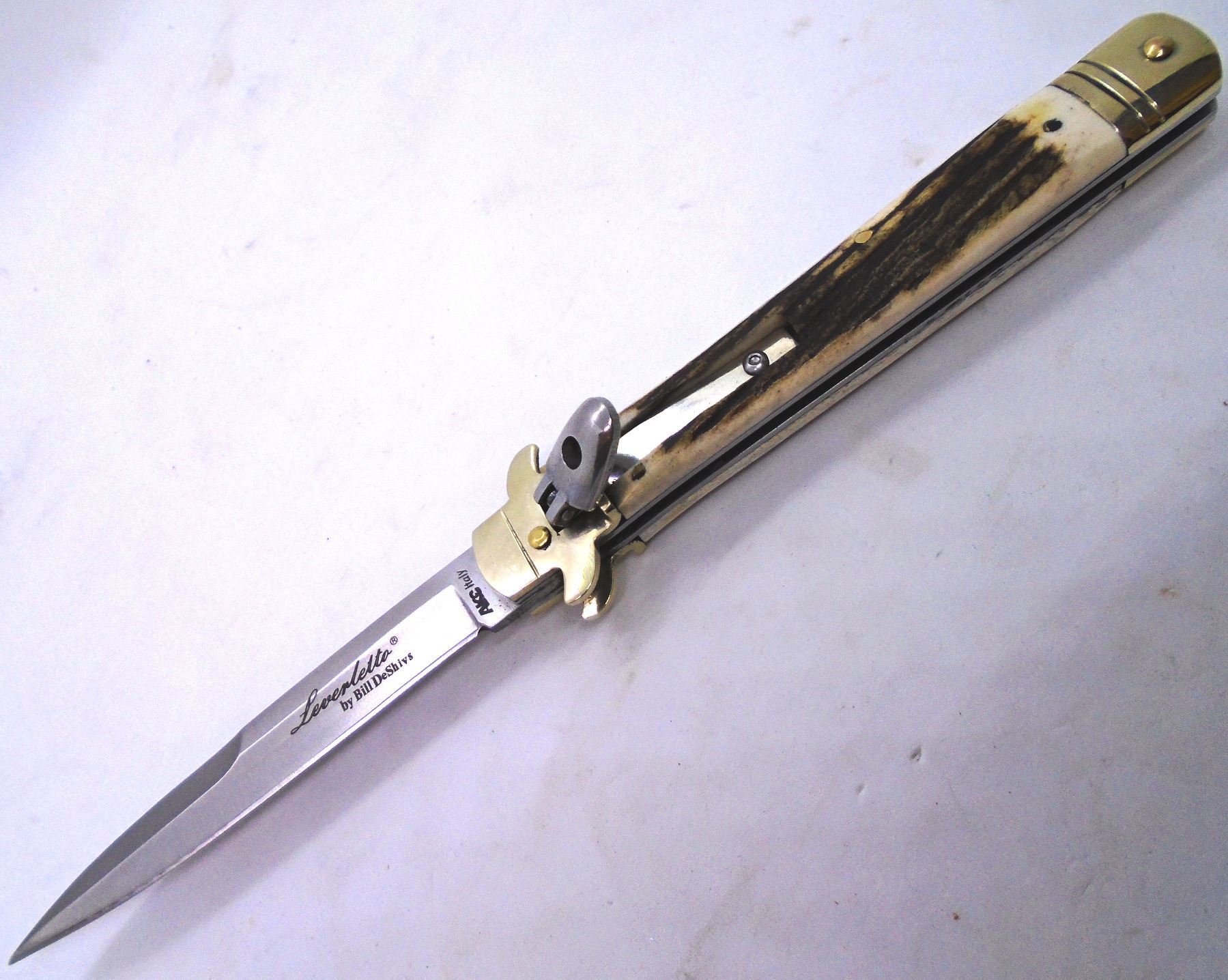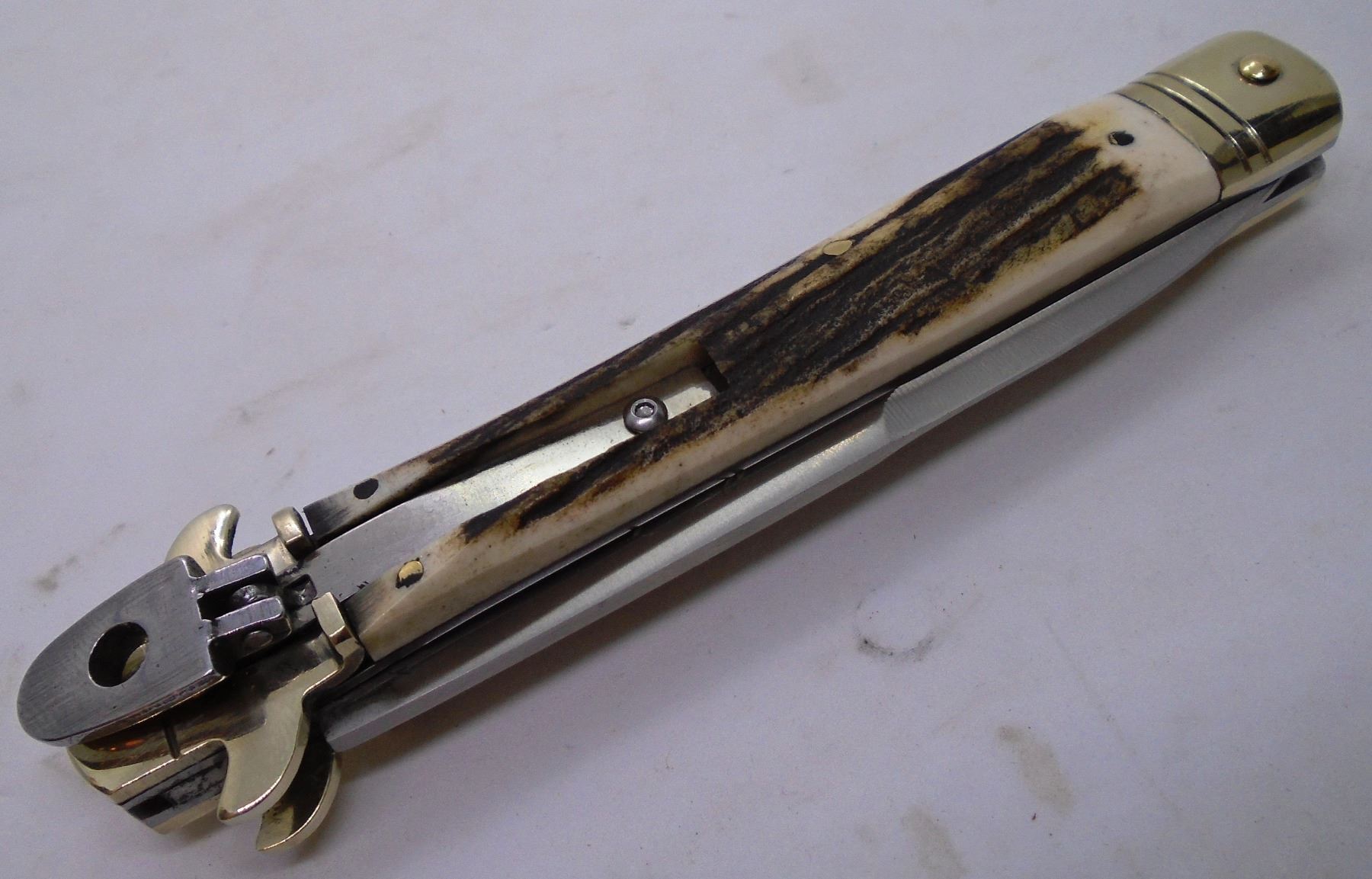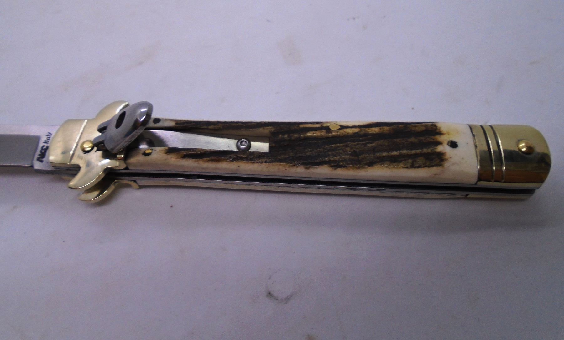 LEVER ACTION AUTOMATIC KNIFE. D2 TOOL STEEL 4 1/4" BLADE, STAG SCALES. 9 5/8" OVERALL. (USA SHIPPING $10)