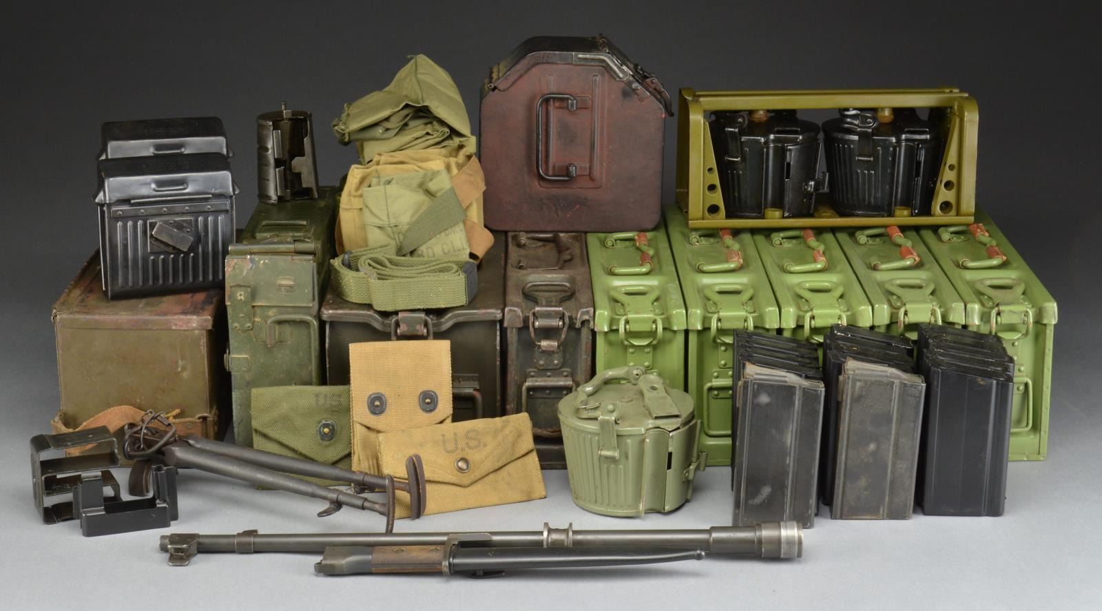 ACCESSORIES & PARTS. 2 Steel 10 rd. German PBZ 38/39 ammo holders. / 6 MG34 Ammo storage cans for belted 8mm ammunition, 5 of which appear either unissued or freshly painted & restored & 1 which appears original as issued, containing normal patinaed finish w/ broken & vacant leather strap material. / 1 MG34/42 feed can w/ side opening & baffles. / 1 MG34/42 oil/petroleum box, containing 2 oil cans & 2 petroleum cans marked “OLEO” & “PETROLEO”. / 3 MG34 metal belt baskets, 2 of which are black & one painted green, also 1 basket carrying frame that holds 2 baskets at once. / 1 MG34 feed can as utilized on twin mount. / 1 Steel can marked “BOX MAGAZINES RIFLE, BOYS, MkI. Approx. 250 rds. of assorted type 8mm ammo on MG34/42 non-disintegrating belts. / 13 Metric pattern FN/FAL 20 rd. mags. / 2 - 20 rd. steel M14 mags. / 1 Jungle clip & 1 mag. loader. / 1 Box assorted web gear & bandoliers. / 1 Navy Arms Co. marked 7mm Johnson rifle bbl. w/ bayonet lug on front sight. / 1 Johnson rifle mag. / 1 Bipod. / 1 FN type A bayonet w/ wood grip scales & scabbard. CONDITION: assorted from very good to as issued & utilized in theatre. (02-14184-2/JZ). $600-900.