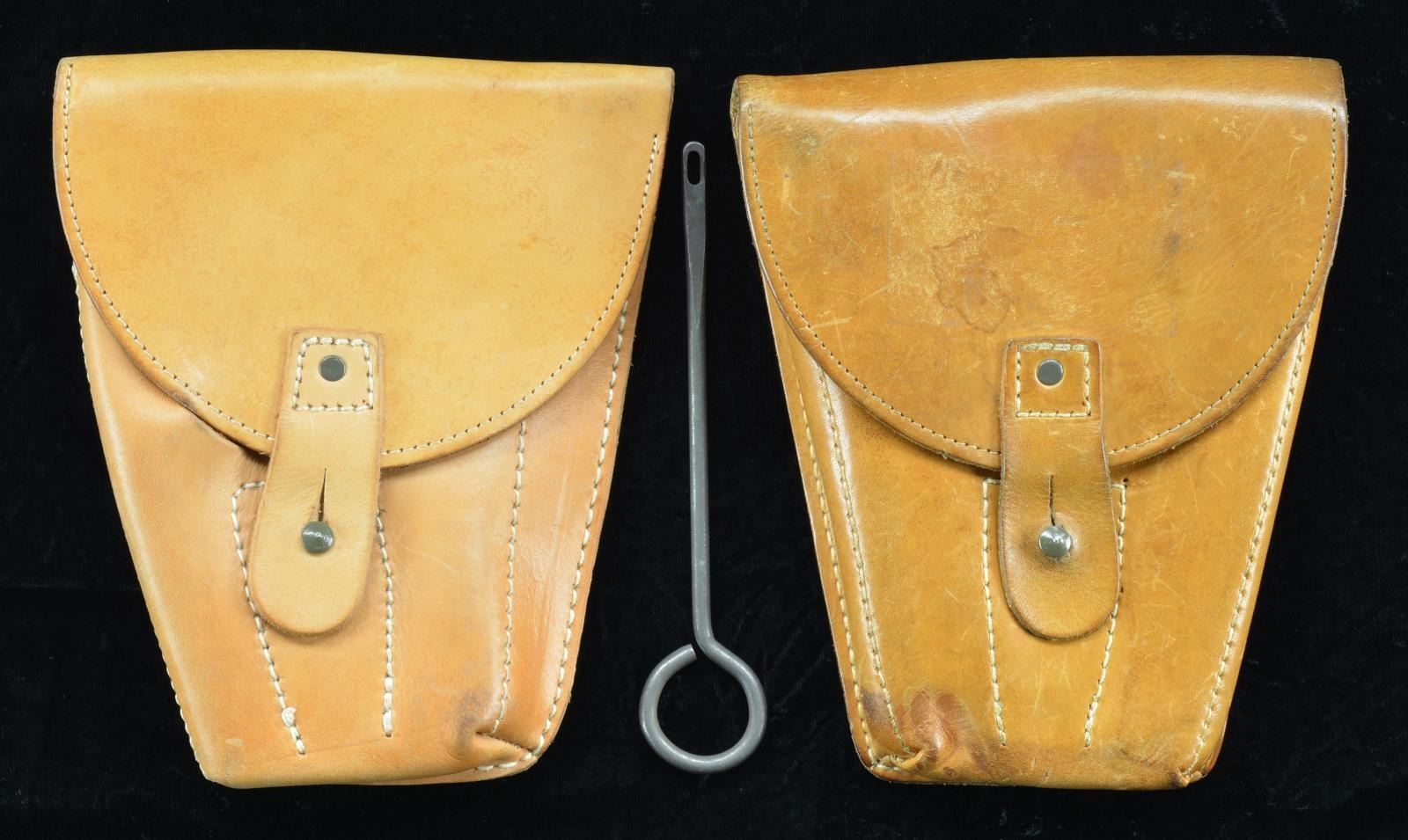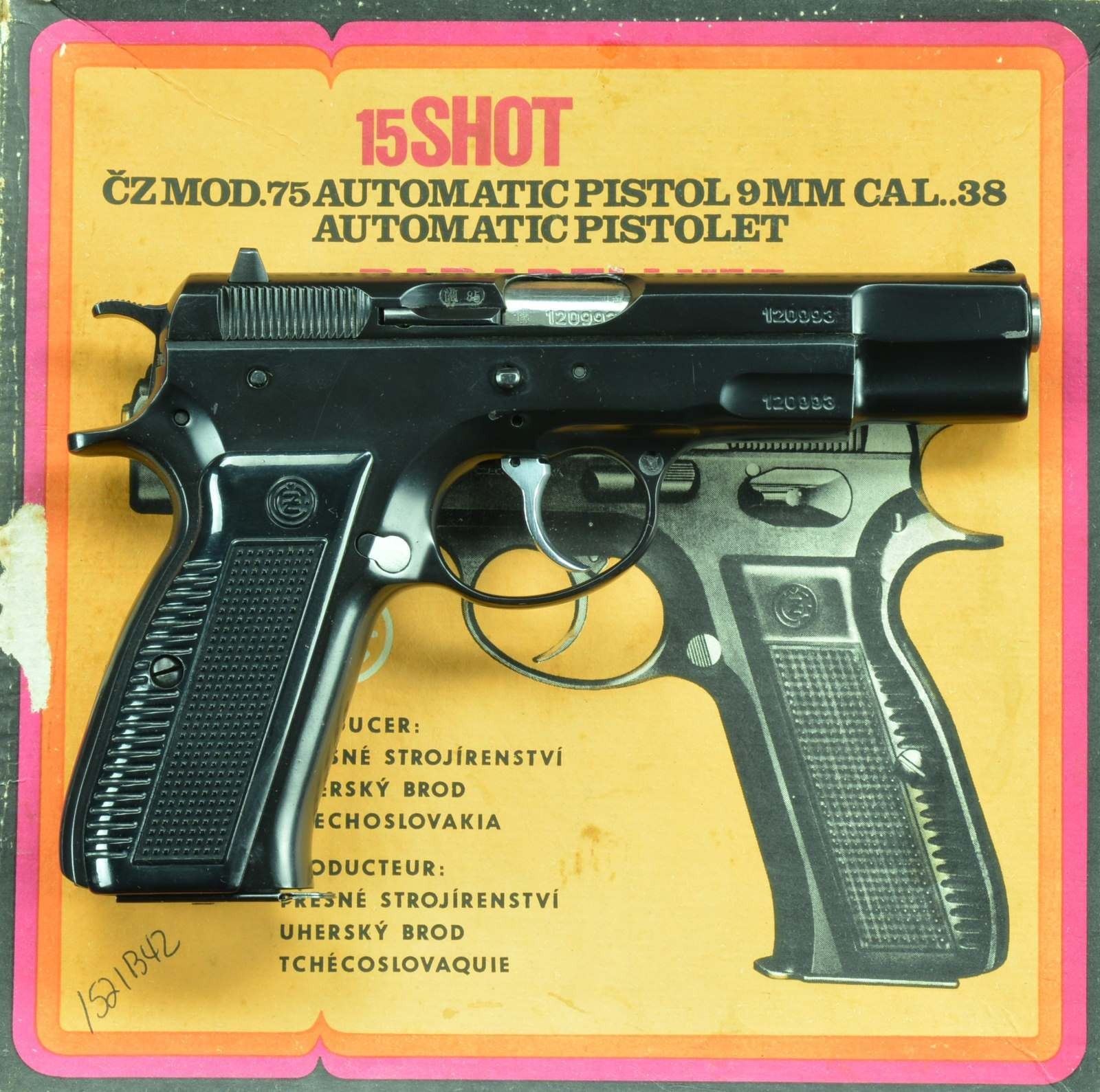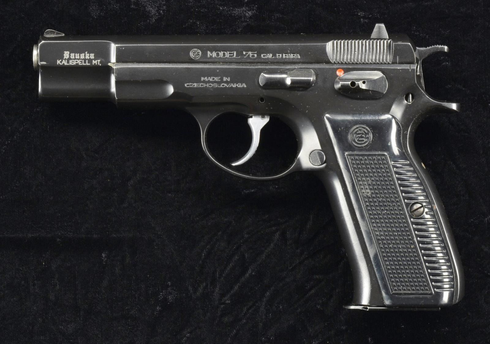 Cal. 9mm P. S# 120993. Bbl. 4.5". Mfg. 1985. A traditional double action pistol w/ steel frame & serrated slide. Fixed front sight w/ drift adj. rear. Serrated hammer spur. Left side controls. Dark black finish uniform on all exposed metal surfaces. Checkered black plastic grips w/ "CZ" monogram. Bauska Import. Matching numbers on frame, slide & bbl. MAGS: 2 steel 15 rd. & 1-15 rd. CZ82. UNATTACHED ACCESSORIES: original box test target, owner's manual, cleaning brush & 2 leather CZ82 holsters. CONDITION: all aspects indicate new or as new. No noticeable degradation to original finish outside of a sm. amount of thinning in areas of mechanical intervention which happen almost immediately. Bright bore w/ strong rifling. Fire control mechanism appears to function correctly when cycled by hand. (22-778/JZ). MODERN. $300-500.