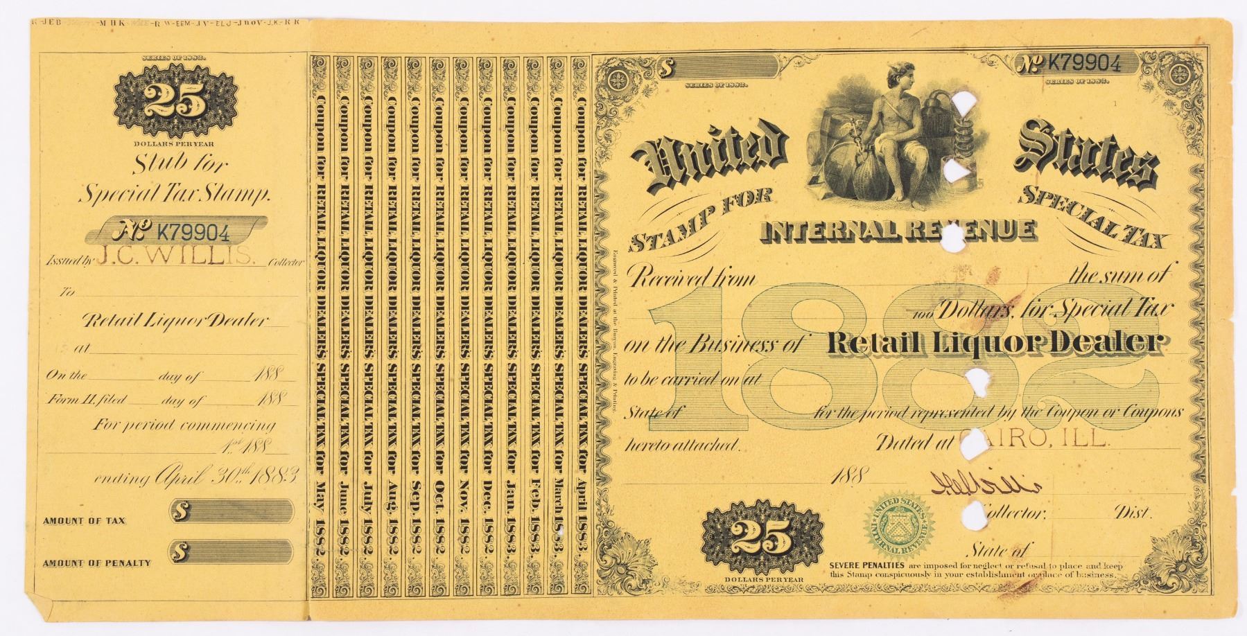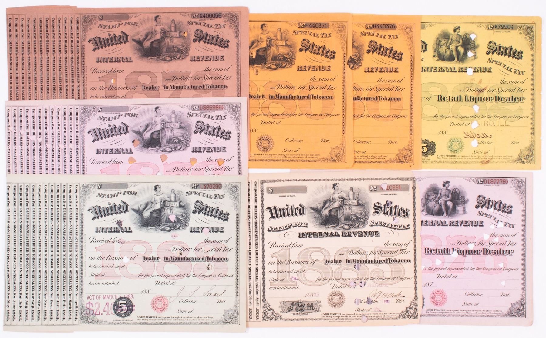 Eight sheets of canceled Internal Revenue tax stamps dating from 1876 to 1885 for liquor or tobacco manufacturers. One stamp is stamped and signed with 'Wm. J. Pollock', possibly a representative from Philadelphia who later worked as a collector for the IRS. 7 x 14.25 inches.