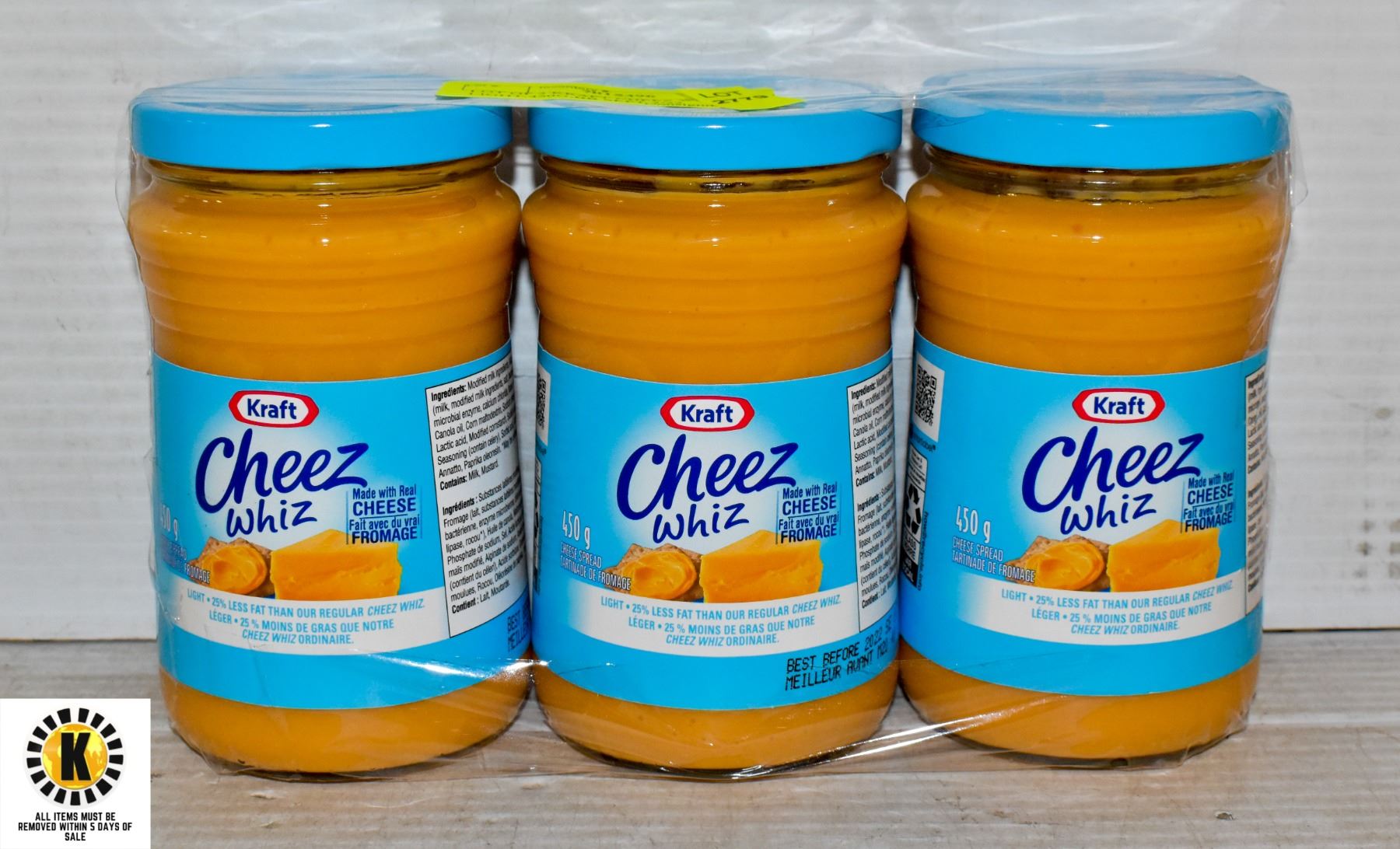LOT OF 3 KRAFT CHEEZ WHIZ LIGHT,450G,BB SEPT 7/22