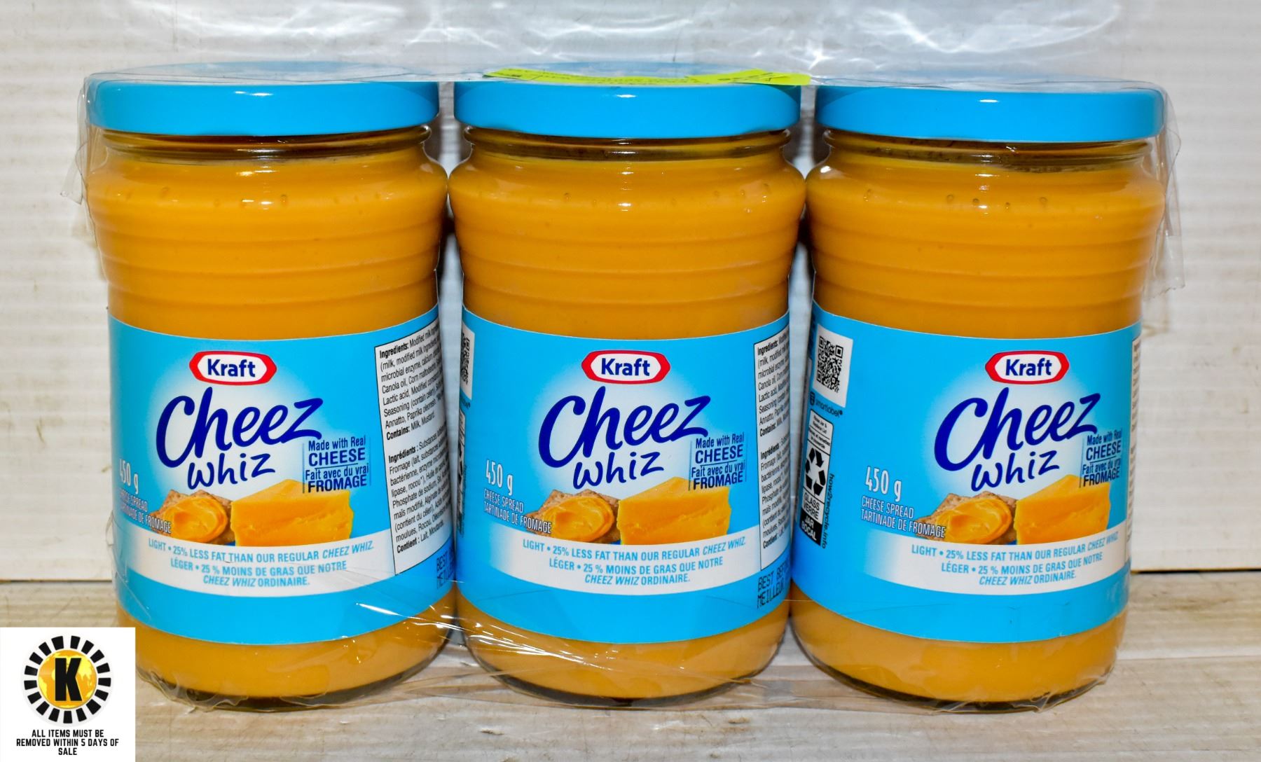 LOT OF 3 KRAFT CHEEZ WHIZ LIGHT,450G,BB SEPT 7/22