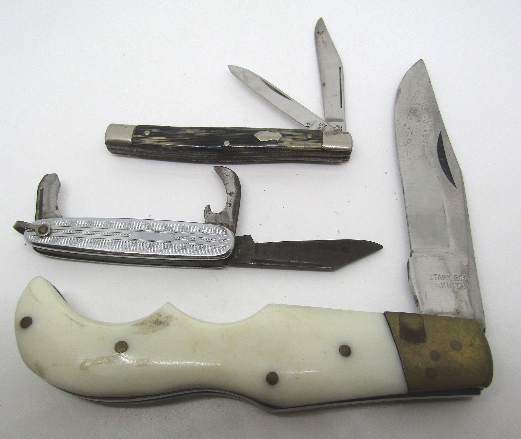 RICHARD'S SHEFFIELD ENGLAND 3.5" TOTAL LENGTH OPENED. PAKISTAN FAUX BONE 7.5" TOTAL LENGTH OPENED. IMPERIAL STAINLESS USA FAUX BULLHORN 5" TOTAL LENGTH OPENED.