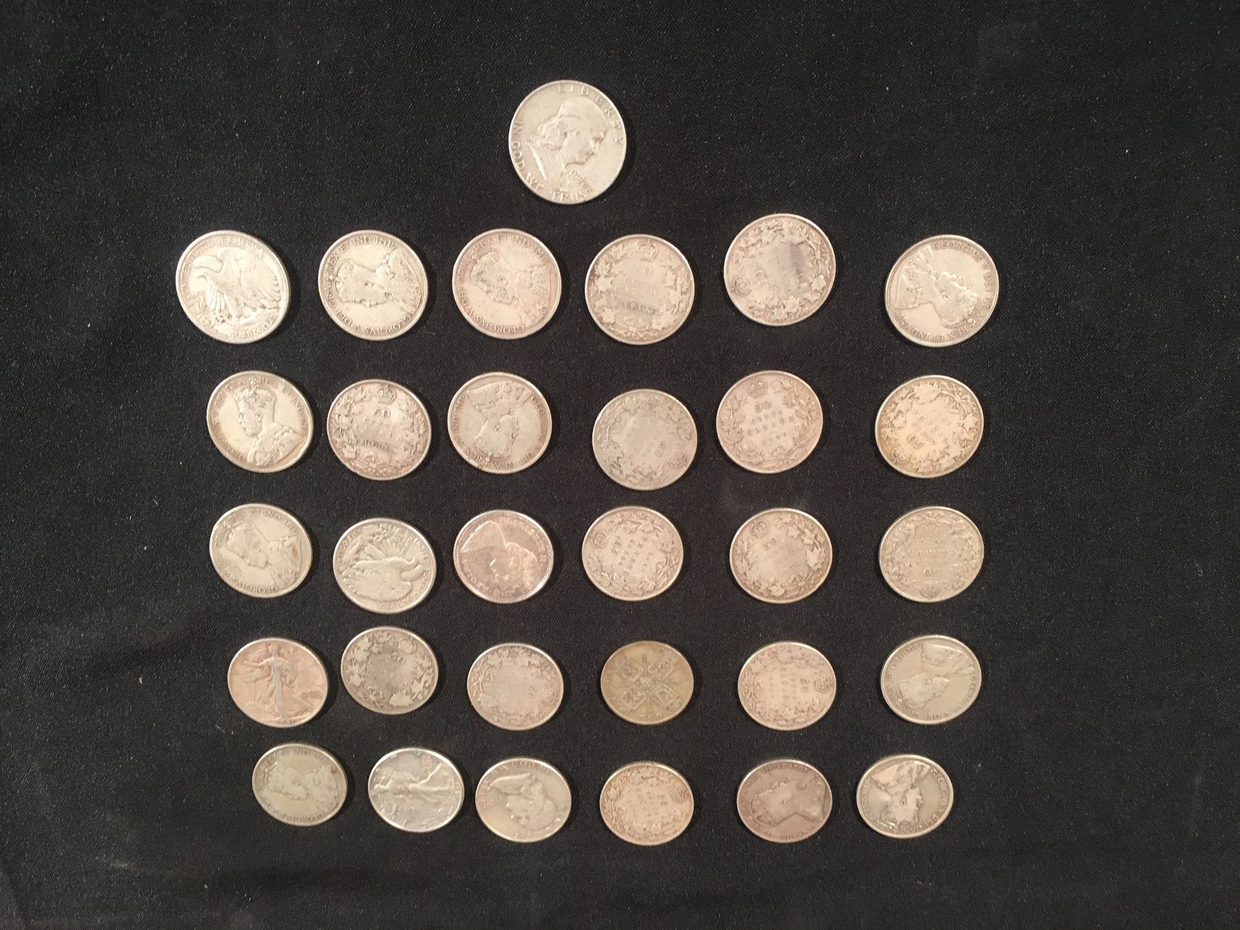LOT OF 31 ASSORTED EARLY TO MID 20TH CENTURY CANADA 50 CENT, US HALF DOLLAR & FLORIAN COINS