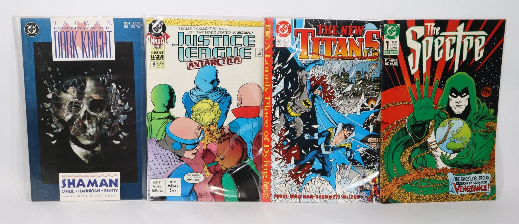 THE NEW TITANS #61 ANNUAL 1990 JUSTICE LEAGUE ANTARCTICA #4 THE SPECTRE #1 BATMAN LEGENDS OF THE DARK KNIGHT NO.4***ITEM(S) LOCATED IN LETHBRIDGE ALBERTA. ALL ITEMS IN THIS AUCTION ARE ELIGIBLE FOR OUR FREE TRANSPORT TO EDMONTON OFFICE SERVICE. WORLDWIDE CANADA POST SHIPPING IS AVAILABLE